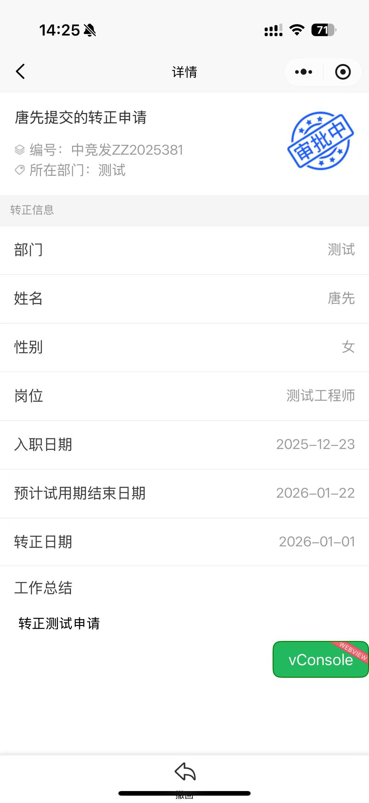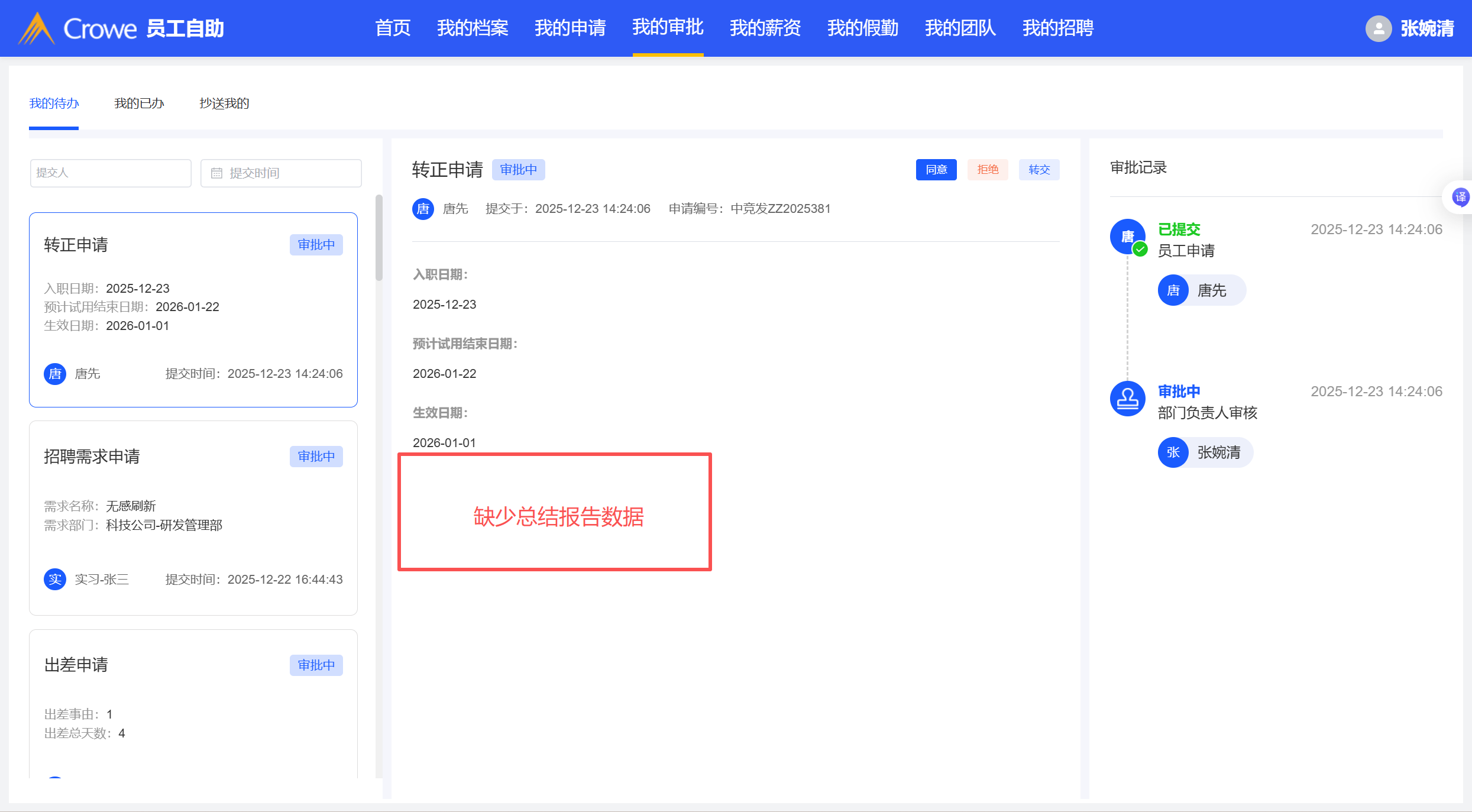 小程序提交的转正申请,负责人的待办审批页面缺少工作总结报告