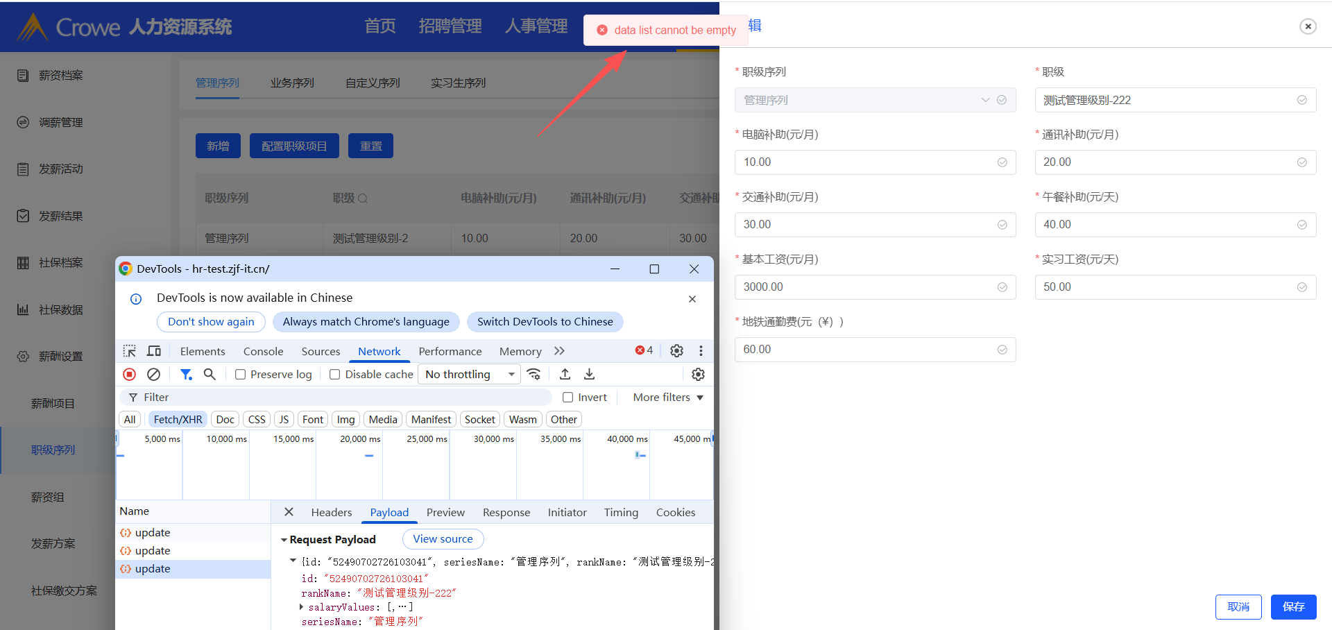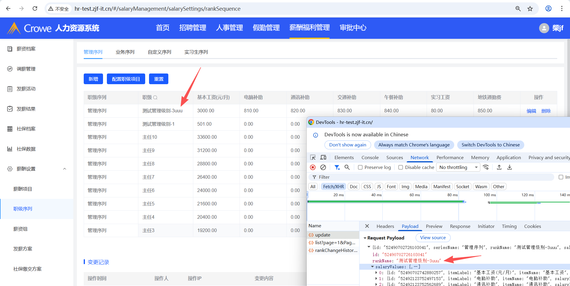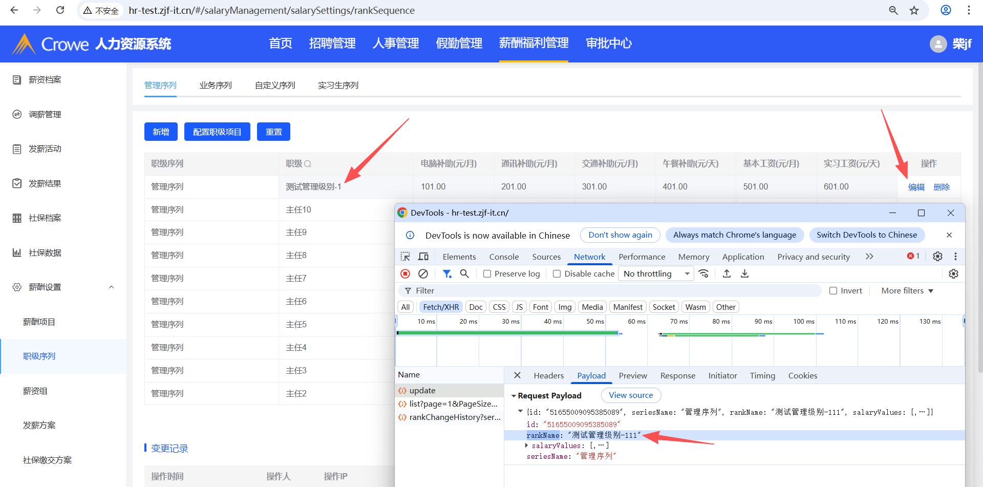 已关闭人力资源系统-薪酬福利管理-职级序列,点击编辑,修改职级,无法修改
