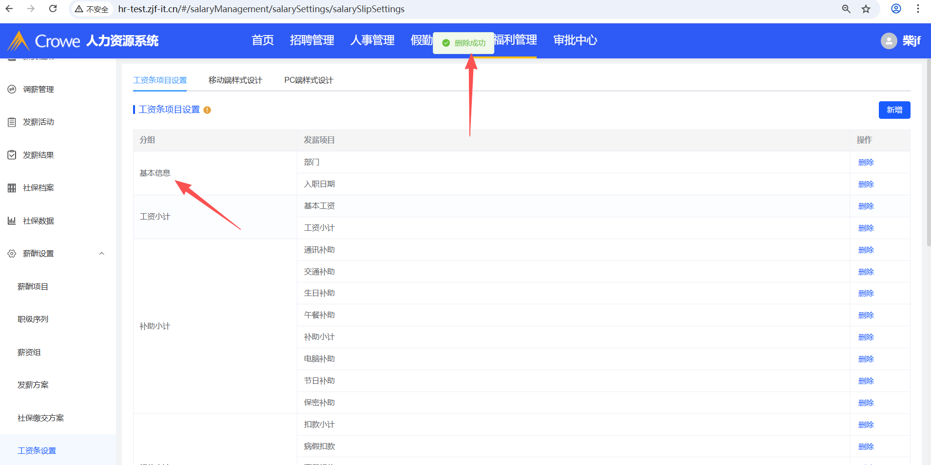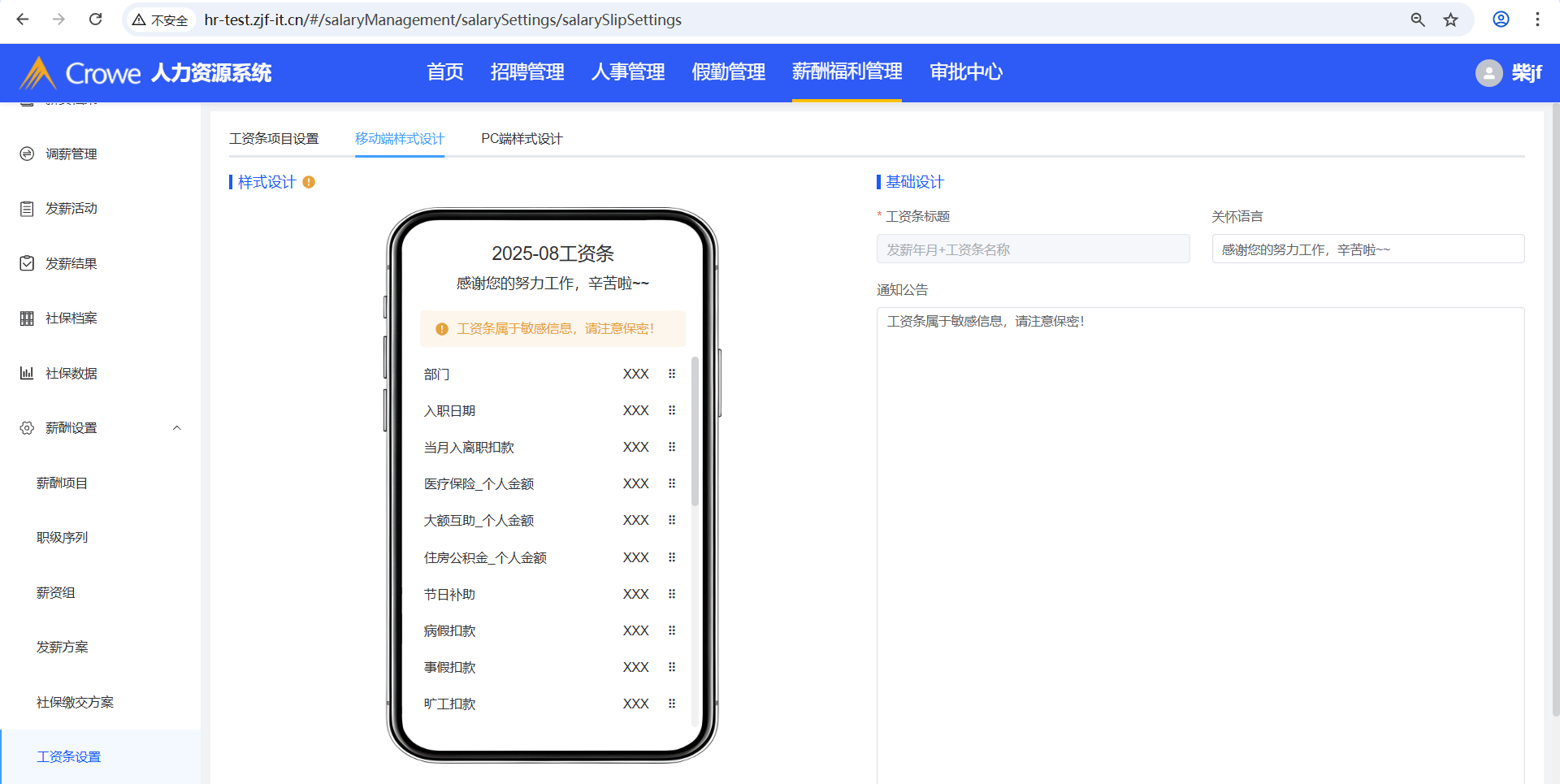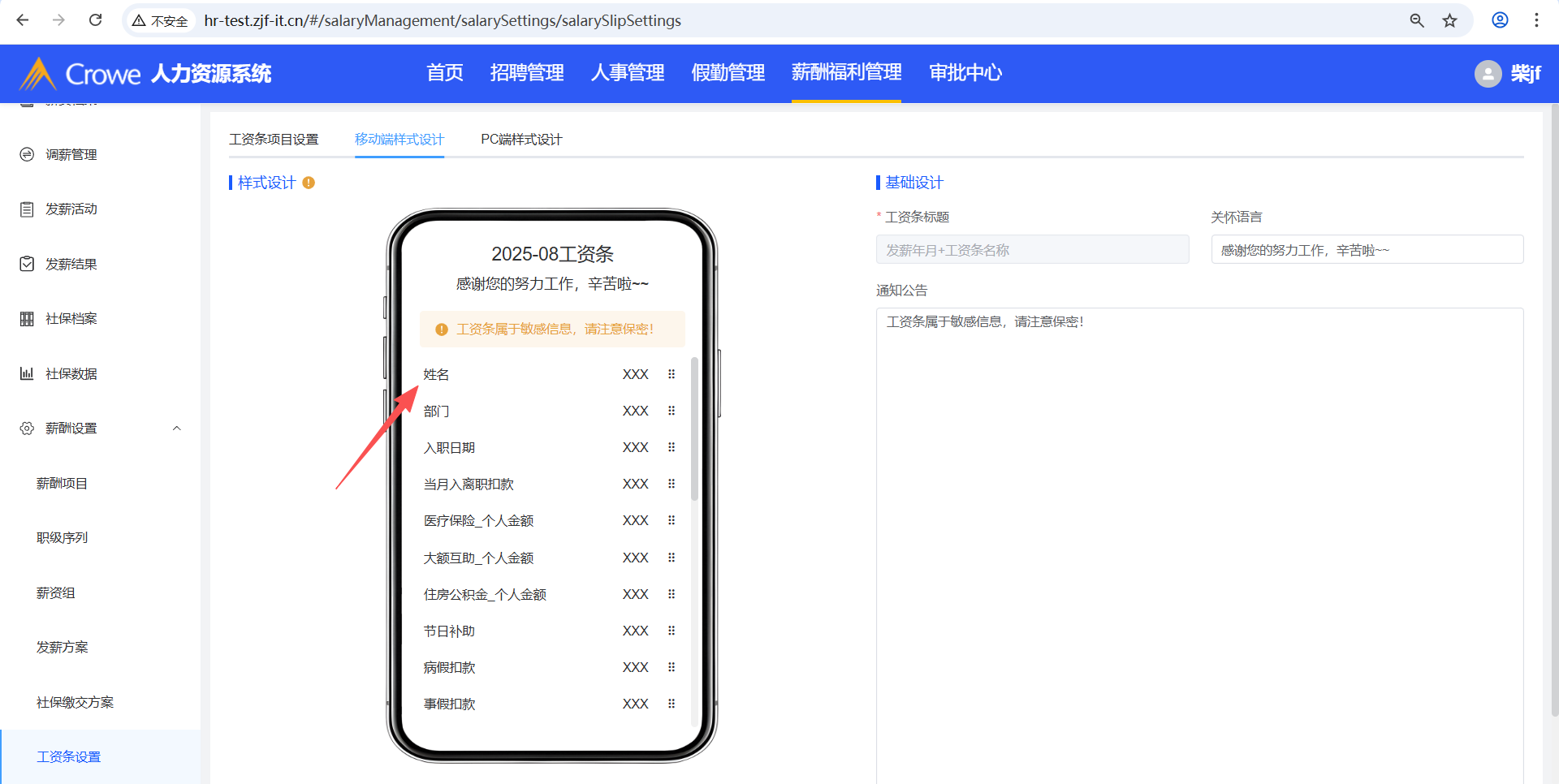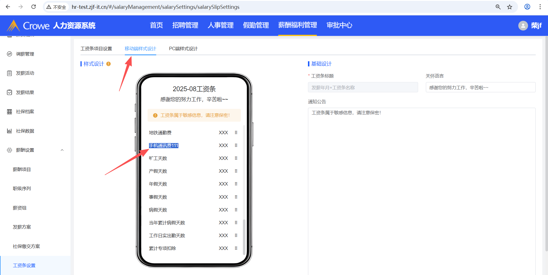 已关闭人力资源系统-薪酬福利管理-工资条设置,在tab页工资条项目设置新增发薪项目A,然后在薪酬项目删除A,预期tab页工资条项目设置、移动端样式设计、PC端样式设计不显示A,实际移动端样式设计仍显示A