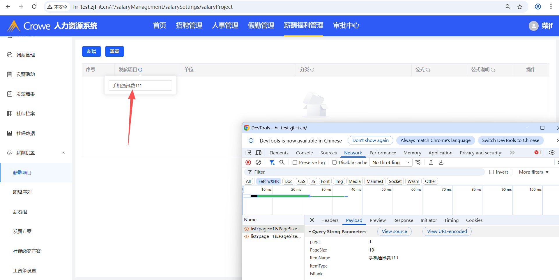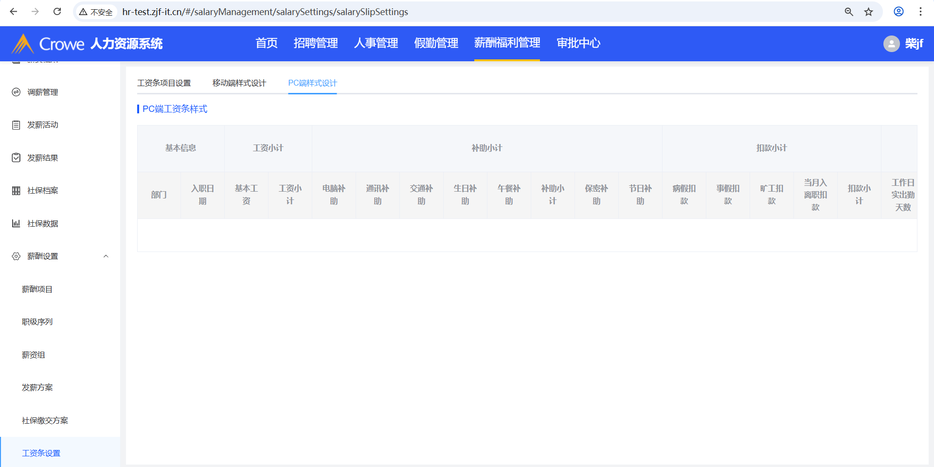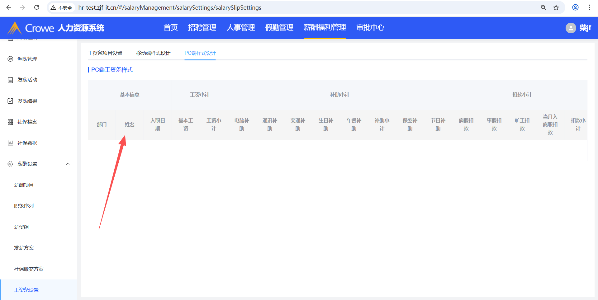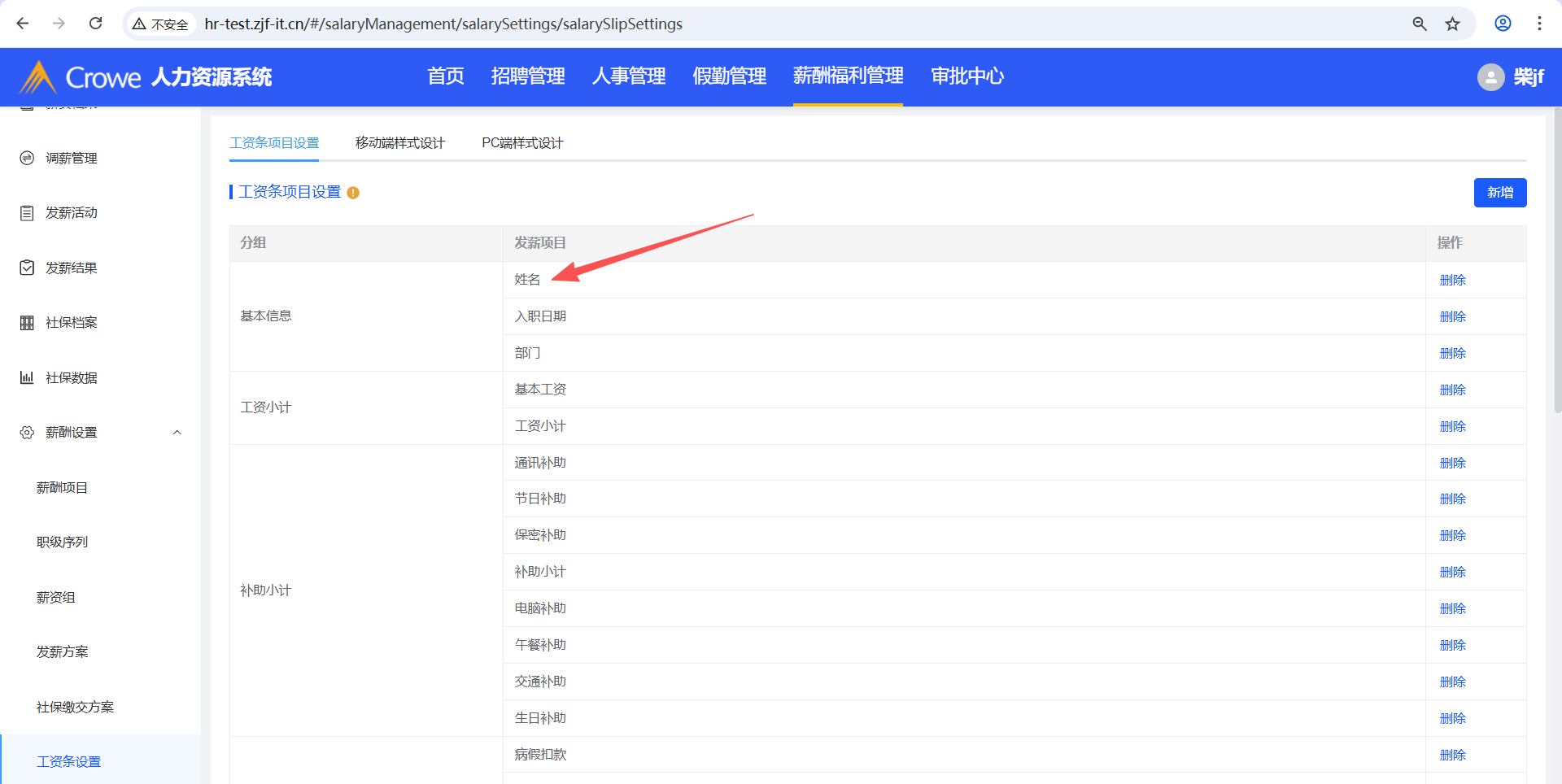 已关闭人力资源系统-薪酬福利管理-工资条设置,在tab页工资条项目设置新增发薪项目A,然后在薪酬项目删除A,预期tab页工资条项目设置、移动端样式设计、PC端样式设计不显示A,实际移动端样式设计仍显示A