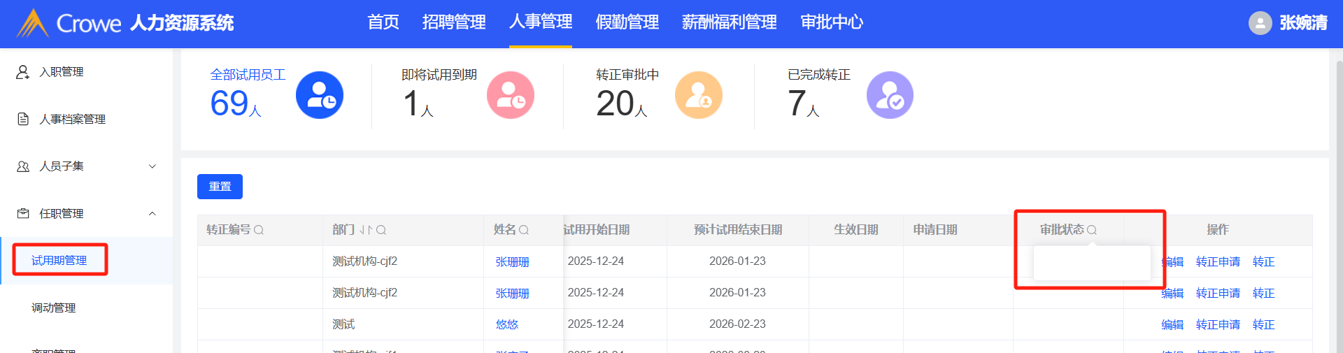 人事管理-试用期管理:审批状态无下拉筛选条件