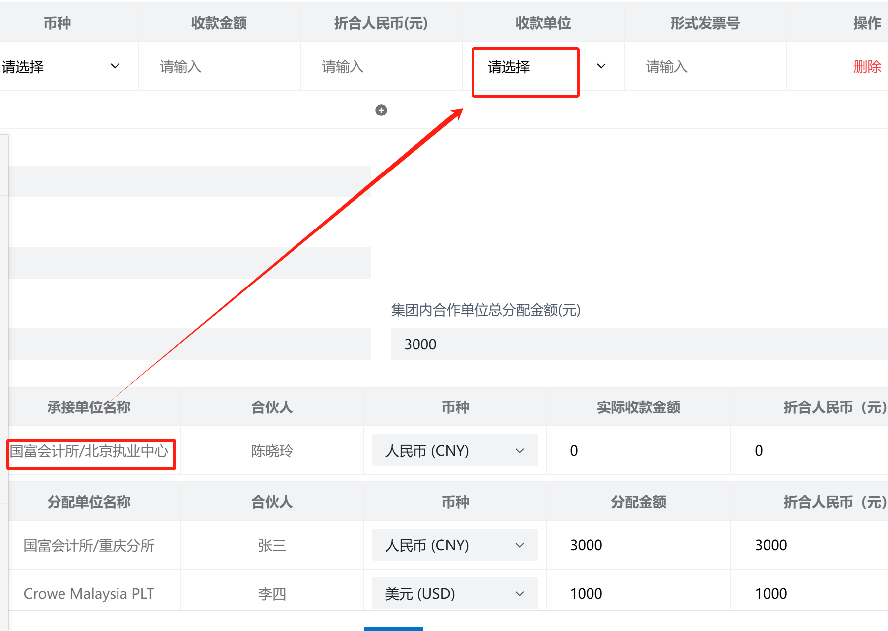 项目收款中收款单位直接由承接单位带出