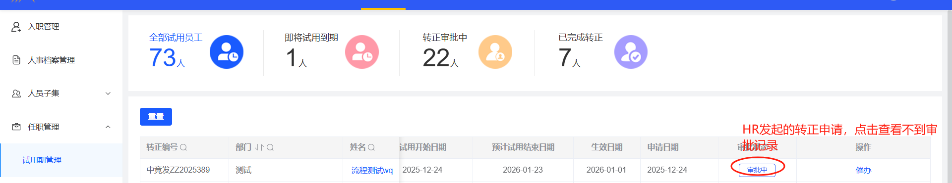 人事管理-试用期管理:HR发起的转正申请,列表中点击审批状态查看不到审批记录