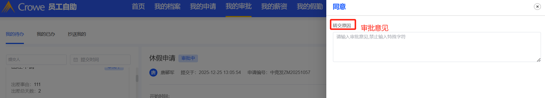 员工自助-我的审批:点击同意,下面显示的“转交原因”