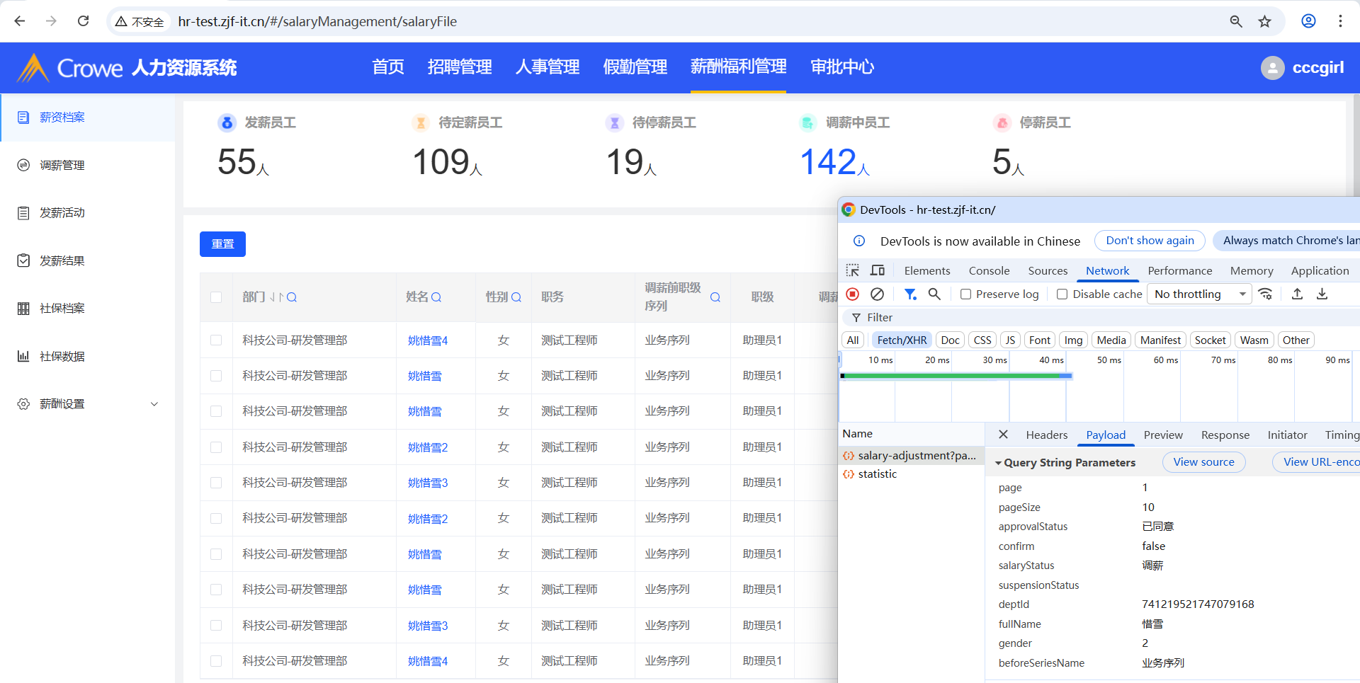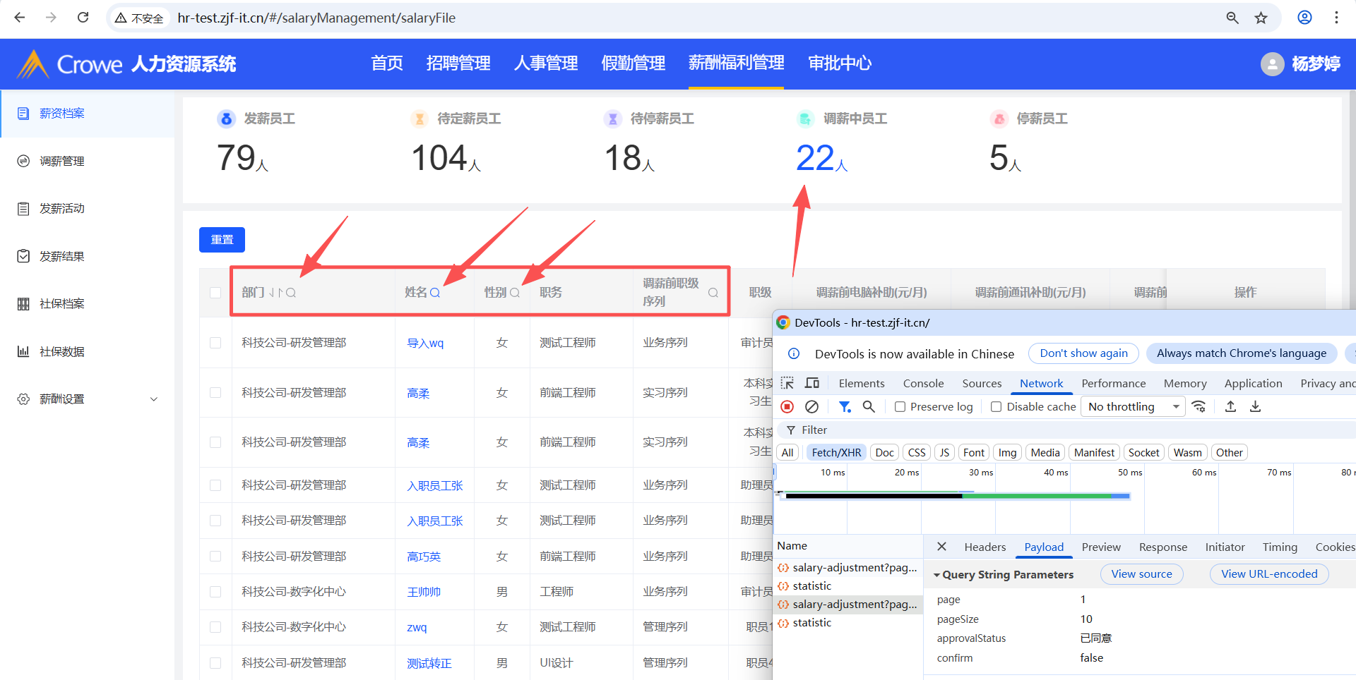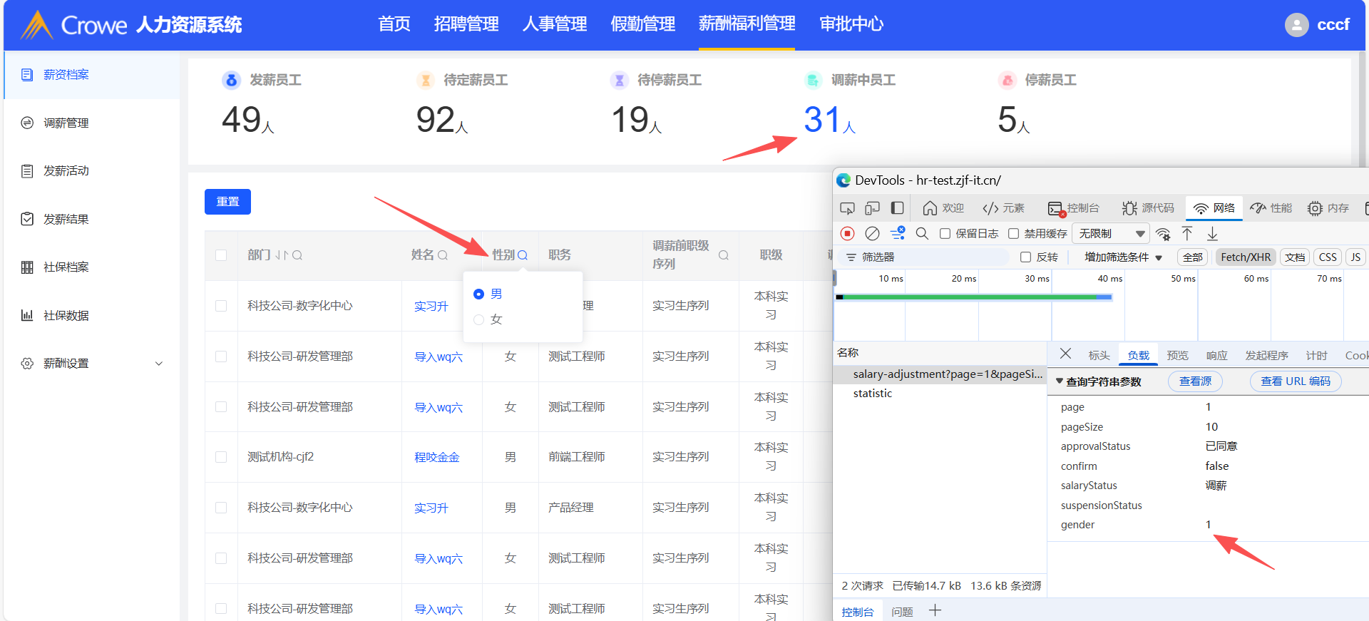 回归测试:调薪中员工,按照性别搜索,搜索不到数据