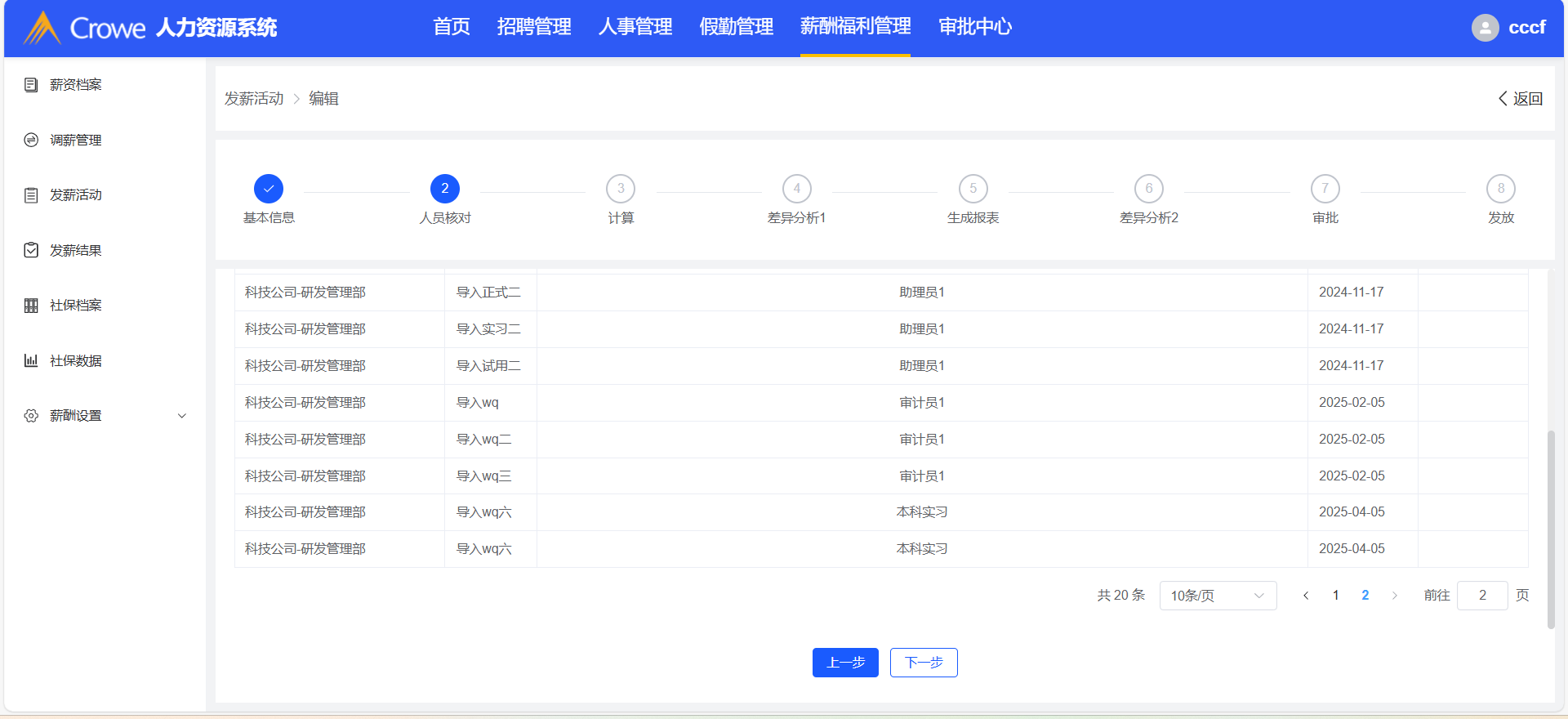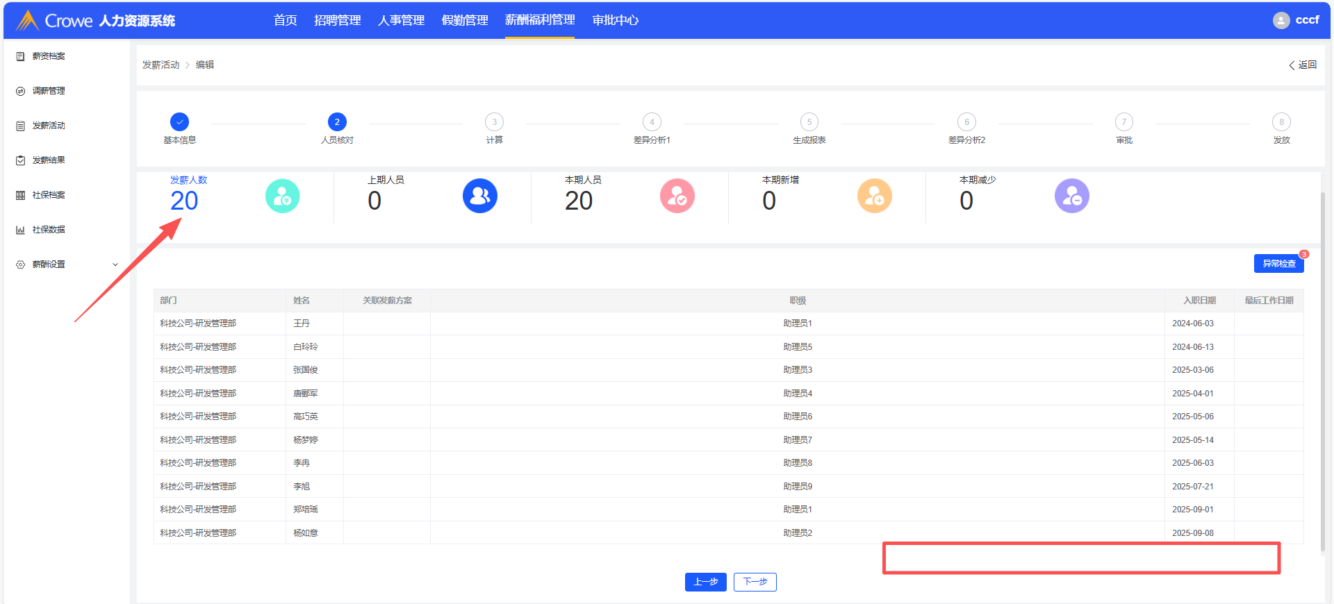 人力资源系统-薪酬福利管理-发薪活动,在人员核对流程,右侧底部未显示分页,无法分页