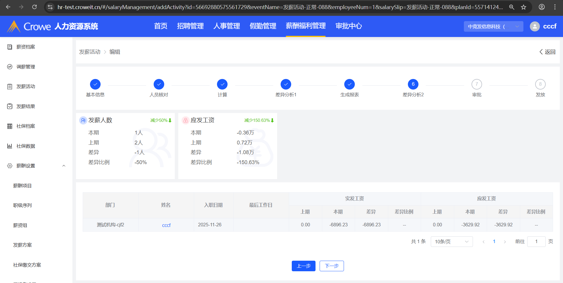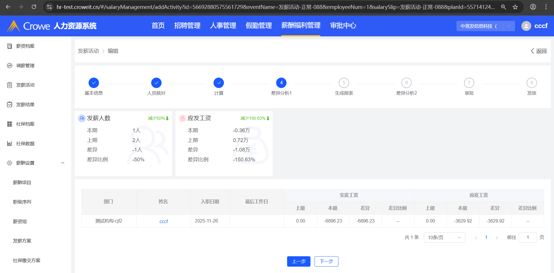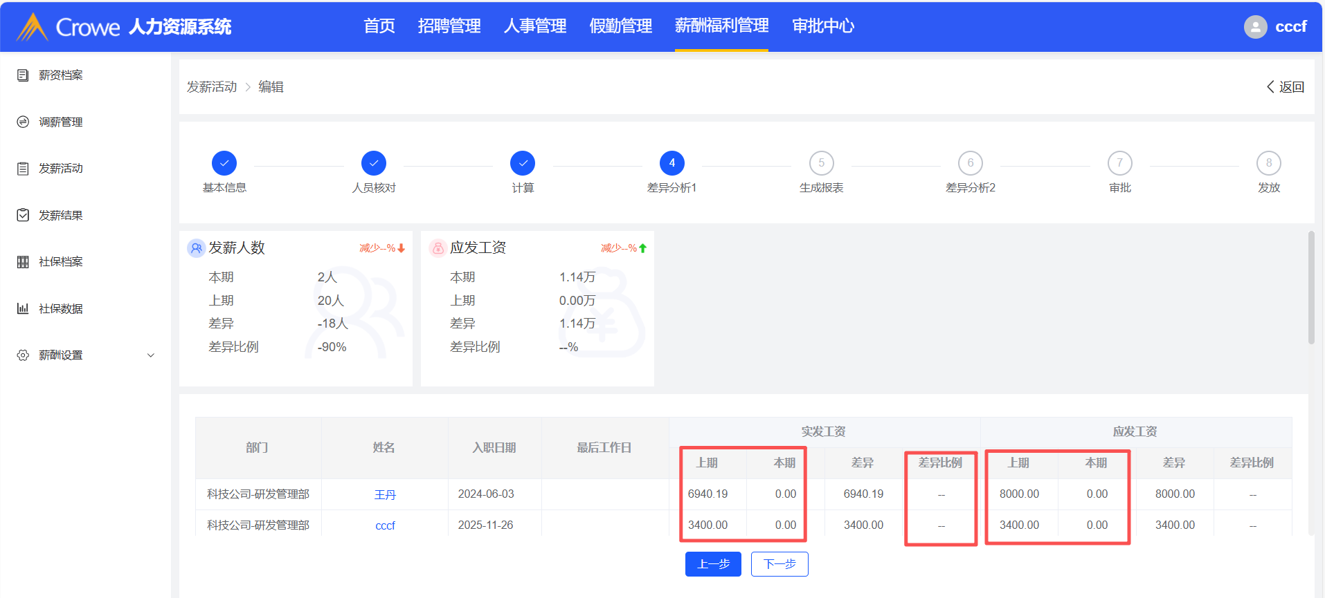人力资源系统-薪酬福利管理-发薪活动,差异分析1流程,实发工资、应发工资的上期、本期、差异、差异比例的值,取反了,需重新排查
