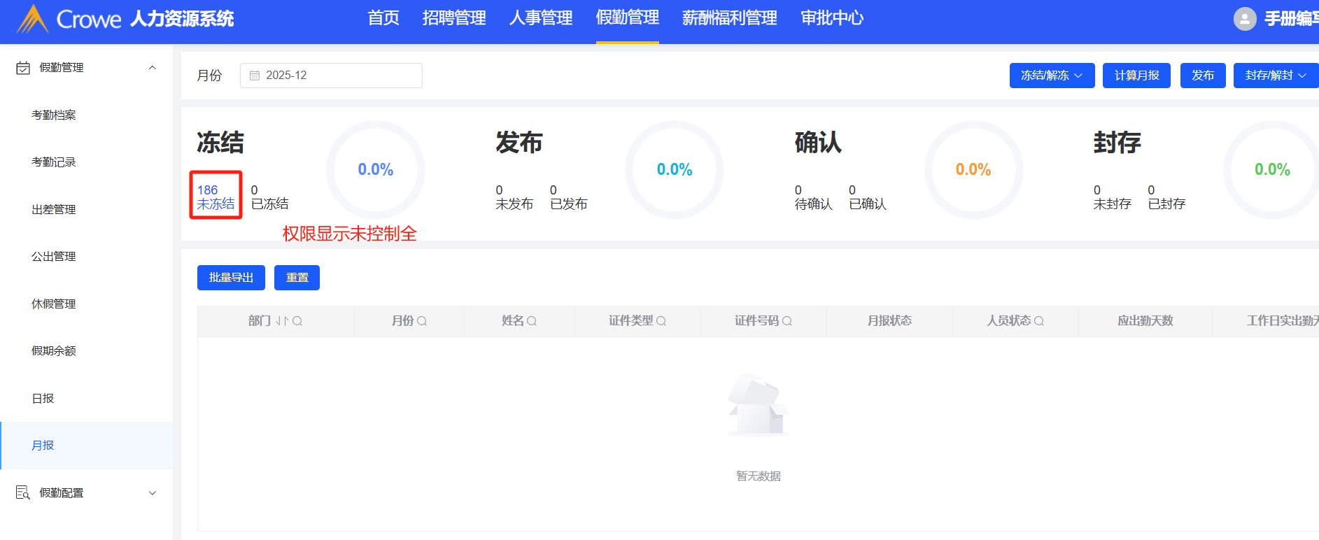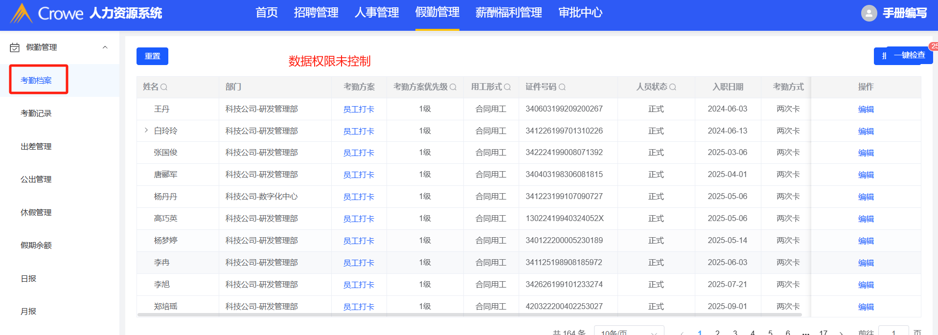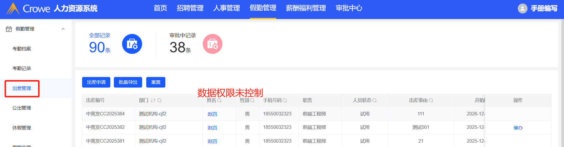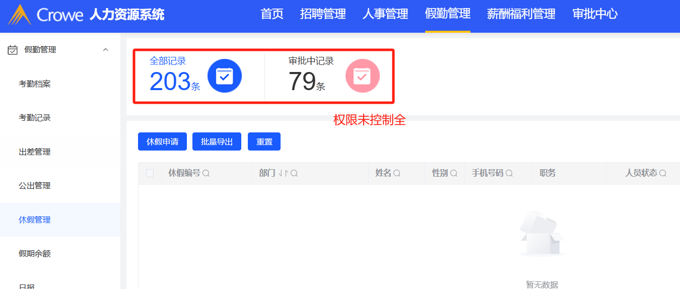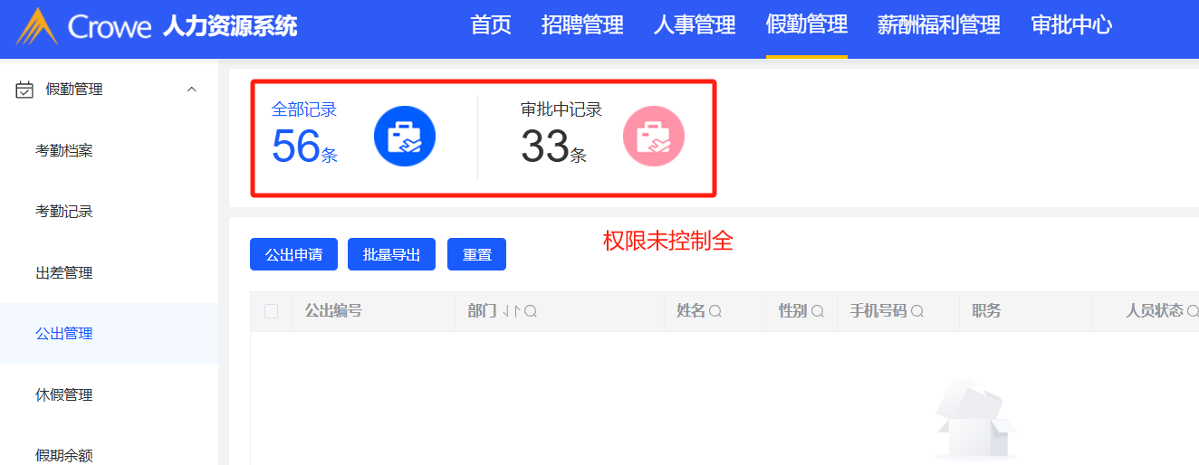 假勤管理:考勤档案、出差管理、公出管理、月报等模块权限未控制全