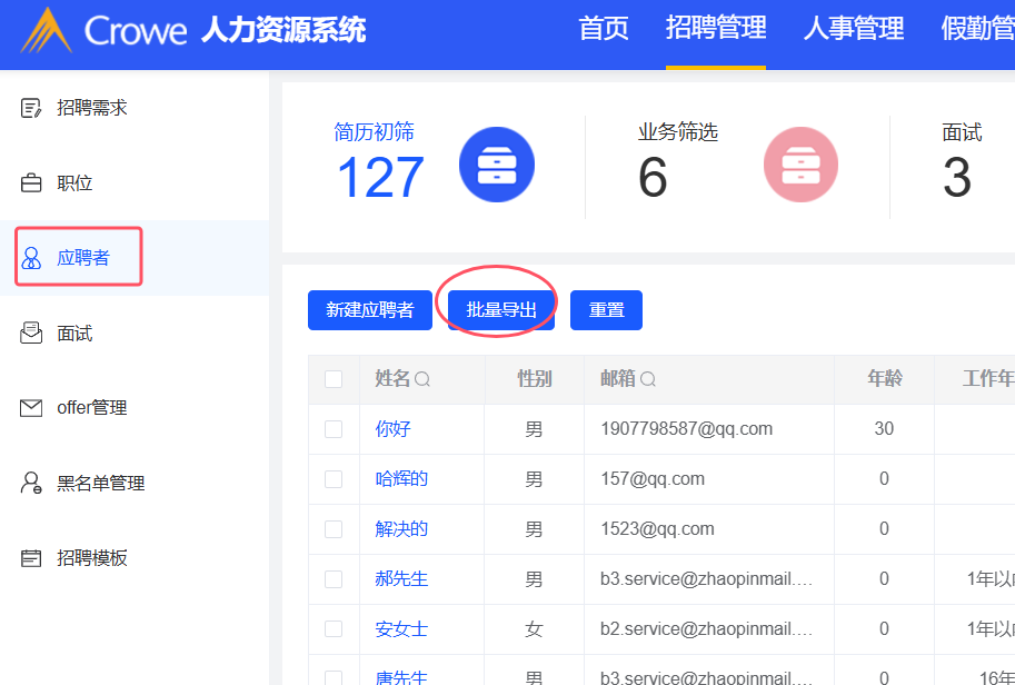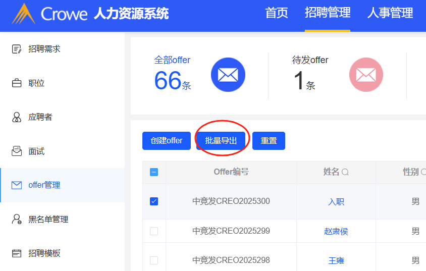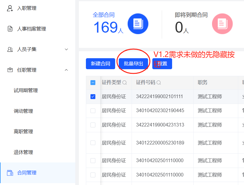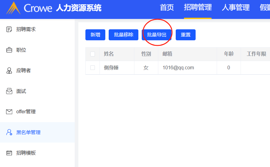 人事管理-合同管理、黑名单管理,招聘管理-黑名单管理、offer管理、应聘者的导出按钮先隐藏