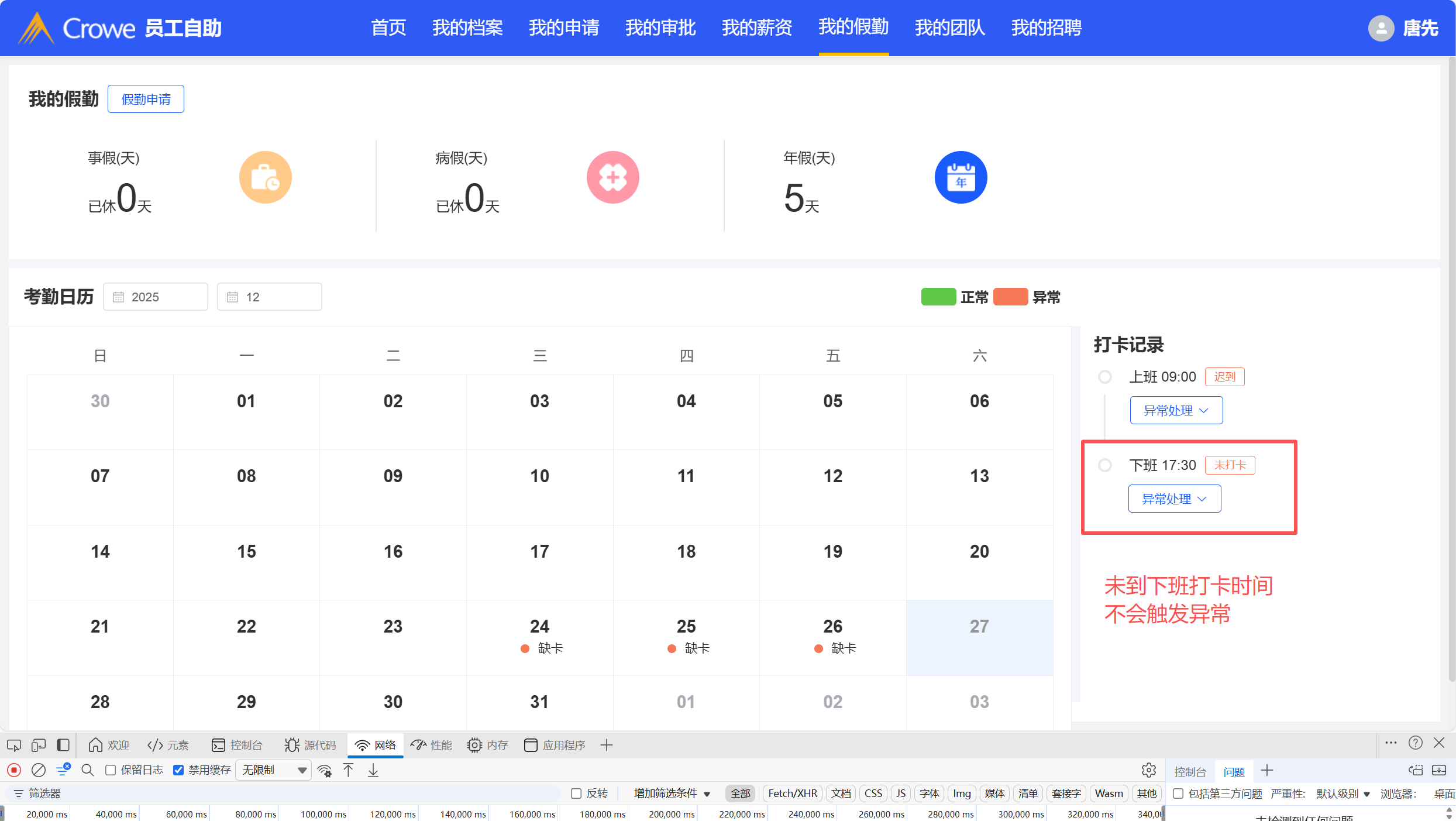 当天的打卡记录,未到下班时间不会触发异常,不需要去处理异常