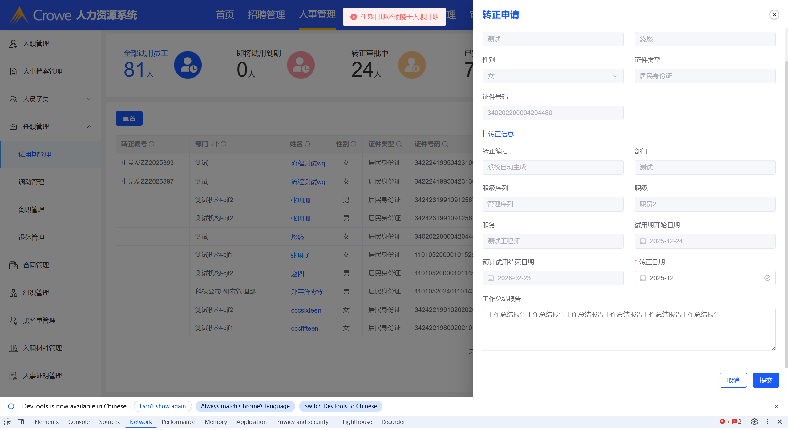 转正申请中,转正日期规则提示修改名称:“生效日期”修改为“转正日期”