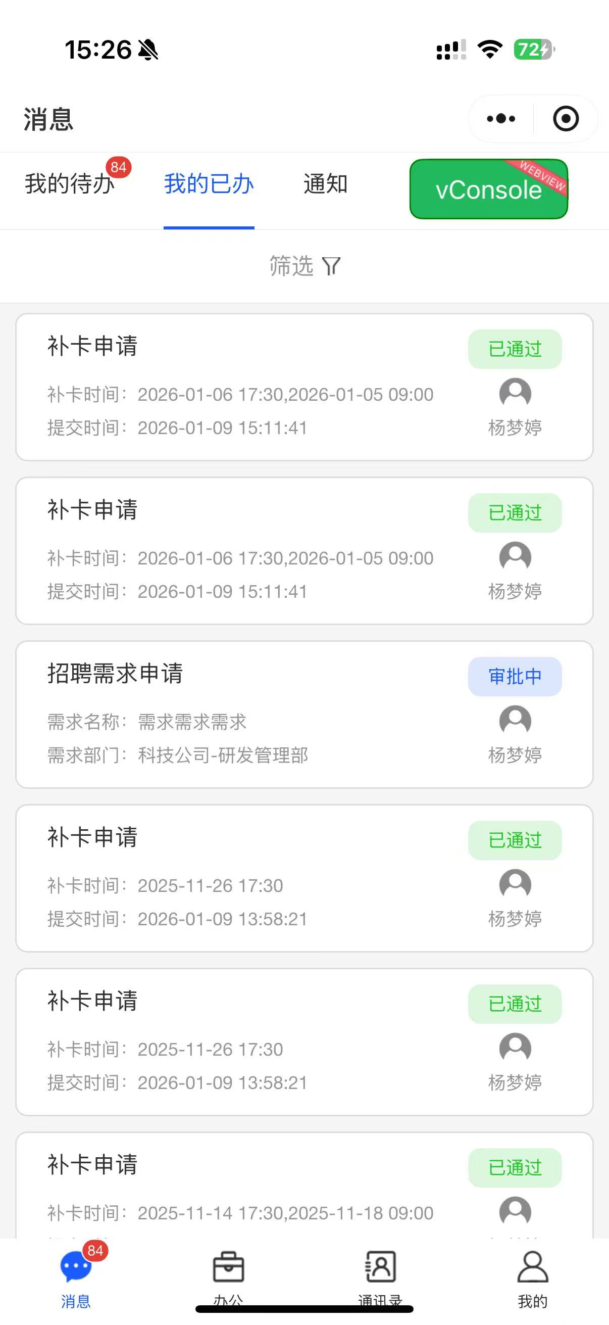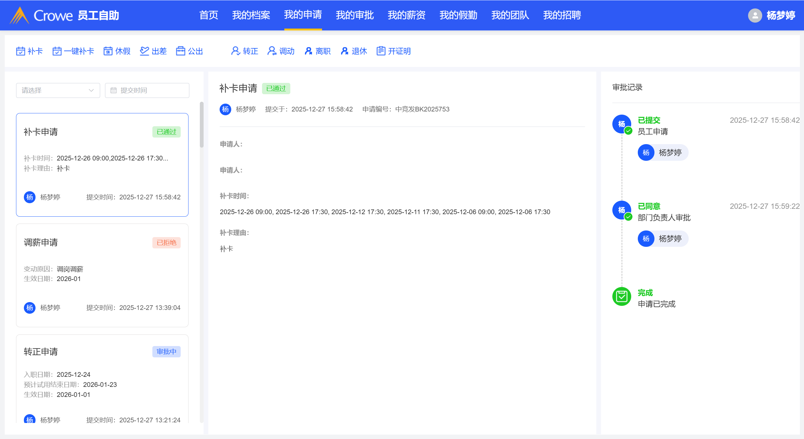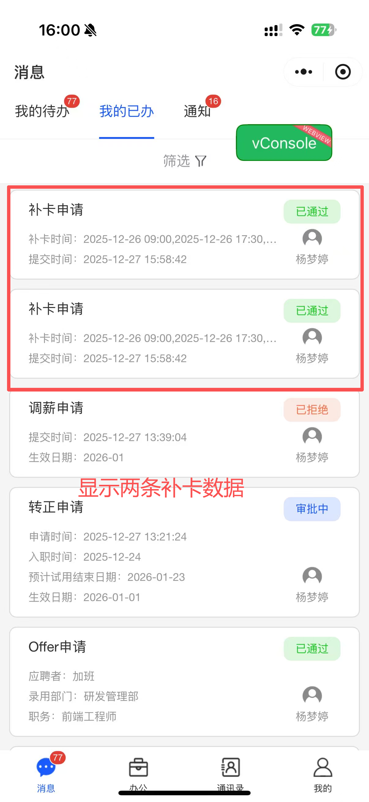 已关闭小程序-小程序申请的一键补卡,我的已办列表显示两条审批数据