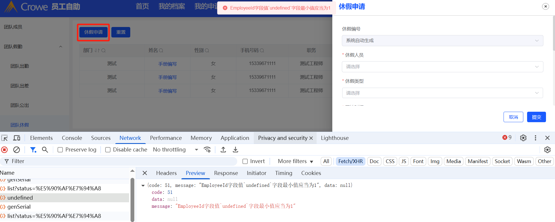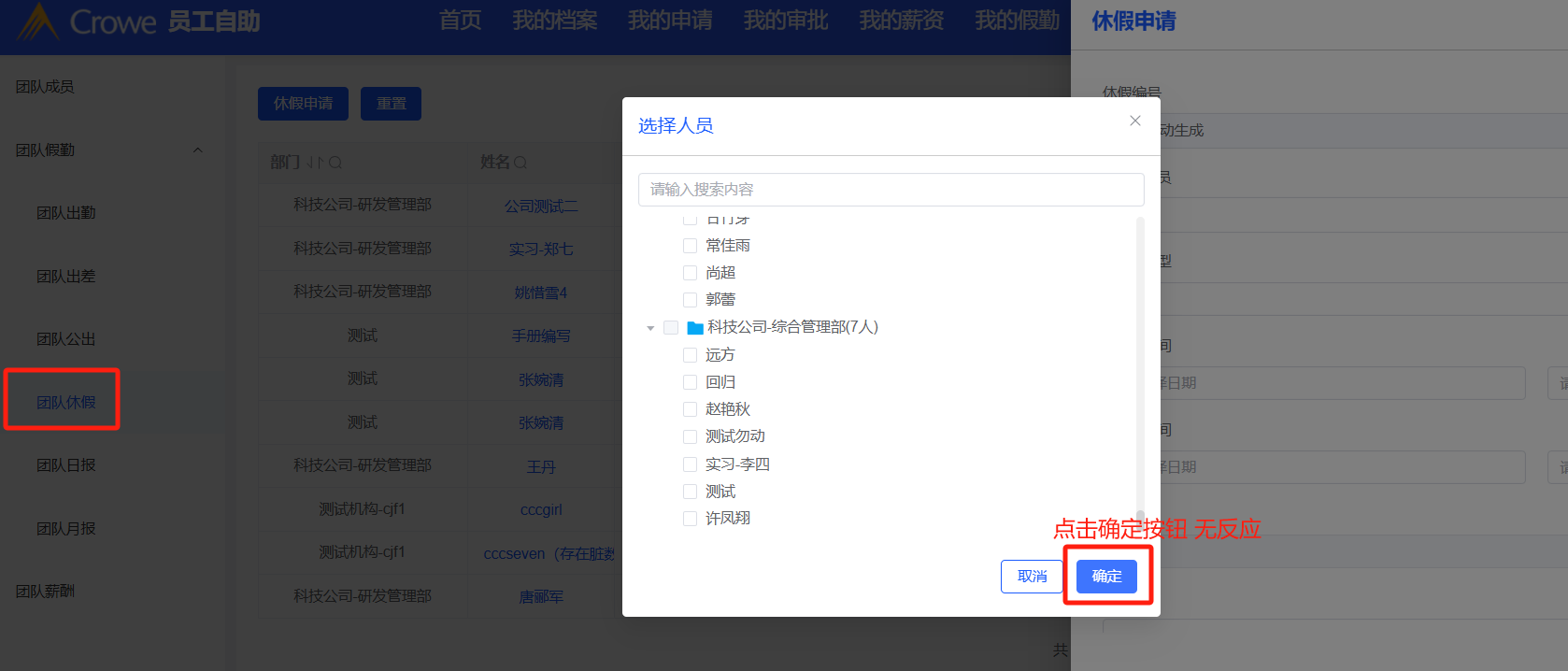 团队休假-点击休假申请报错