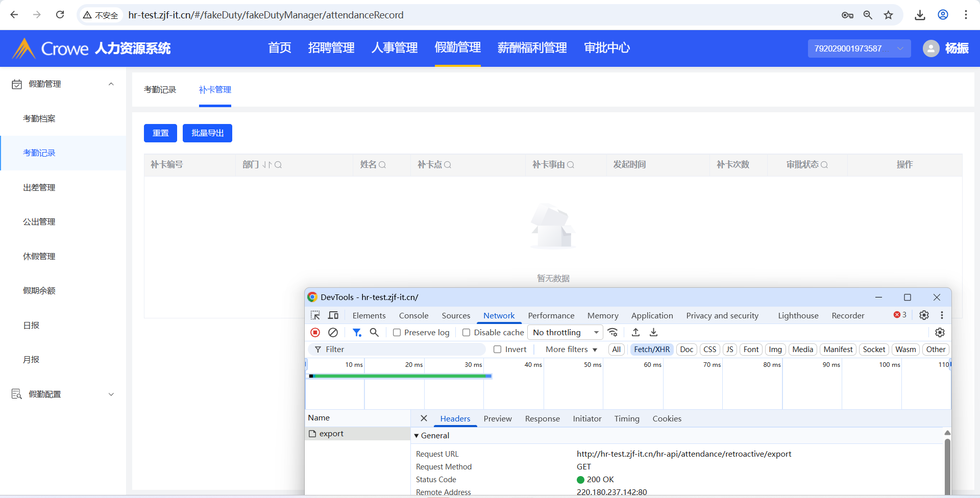 已关闭人力资源系统-假勤管理-考勤记录,补卡管理-批量导出,当前页面无数据,批量导出的文档中却含有其他部门员工的数据,需做权限设置(接口:/attendance/retroactive/export)