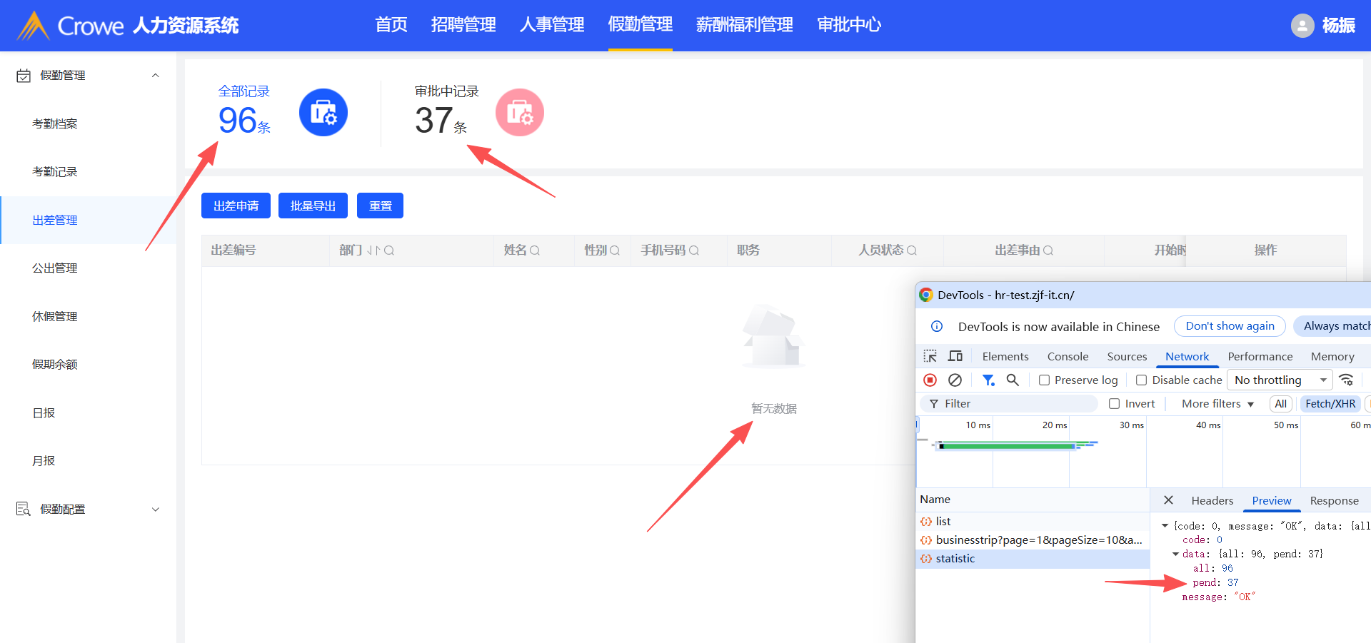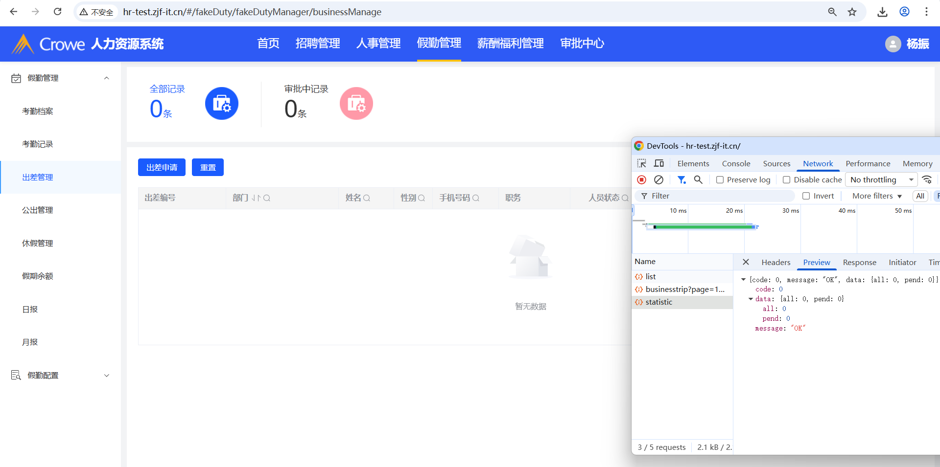 已关闭人力资源系统-假勤管理-出差管理,页面显示暂无数据,但是表头的全部记录、审批中记录仍显示数量,需做权限设置(接口:/businesstrip/statistic)
