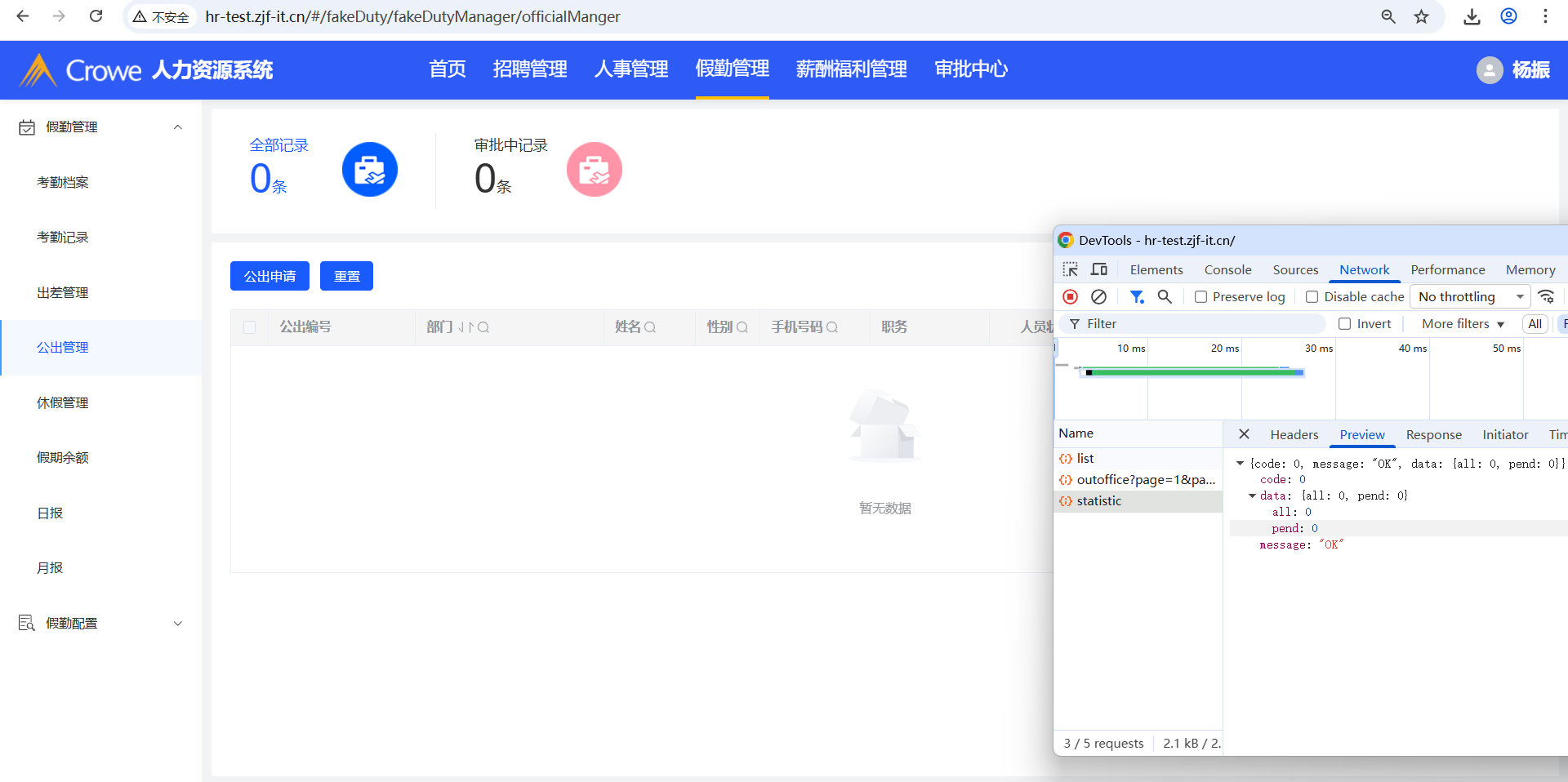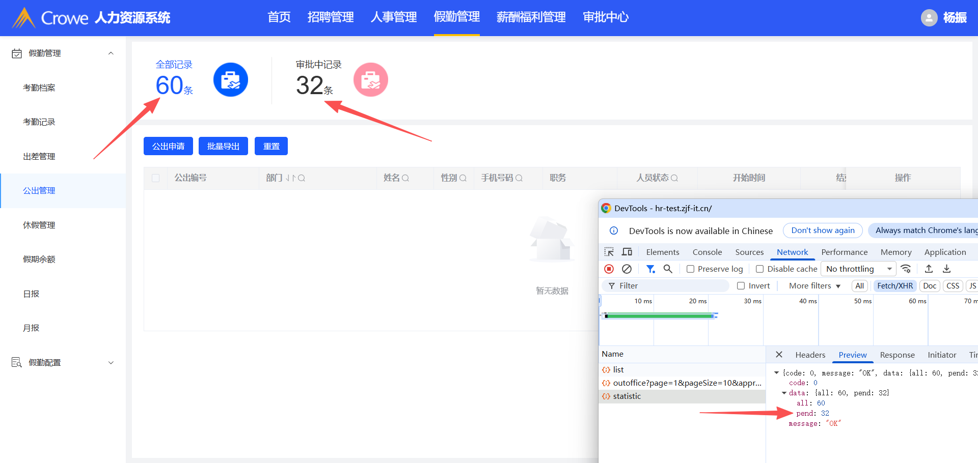 已关闭人力资源系统-假勤管理-公出管理,页面显示暂无数据,但是表头的全部记录、审批中记录仍显示数量,需做权限设置(接口:/outoffice/statistic)