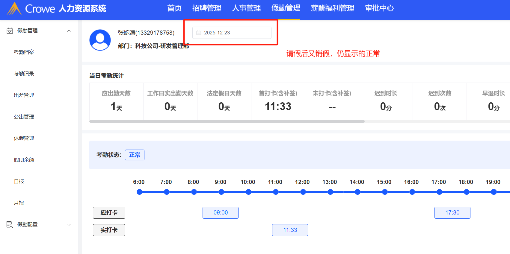 假期管理-考勤记录:请假后又销假,销假后当天显示的考勤记录显示正常