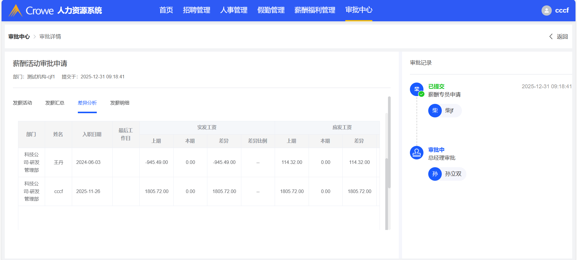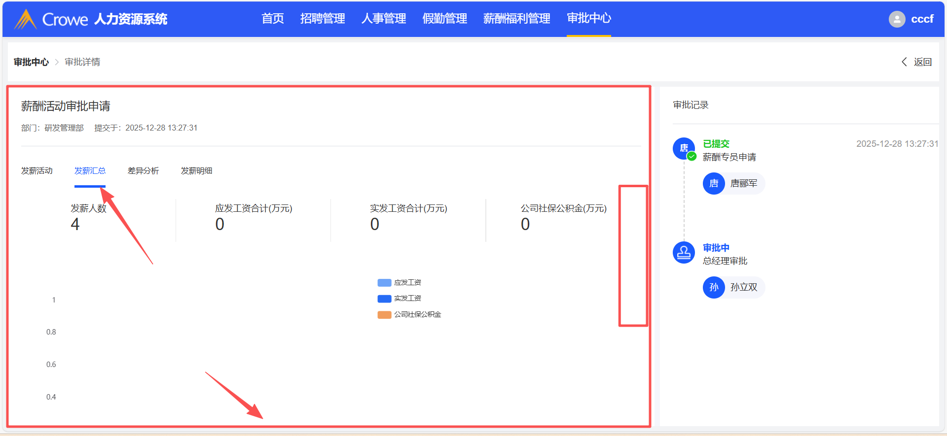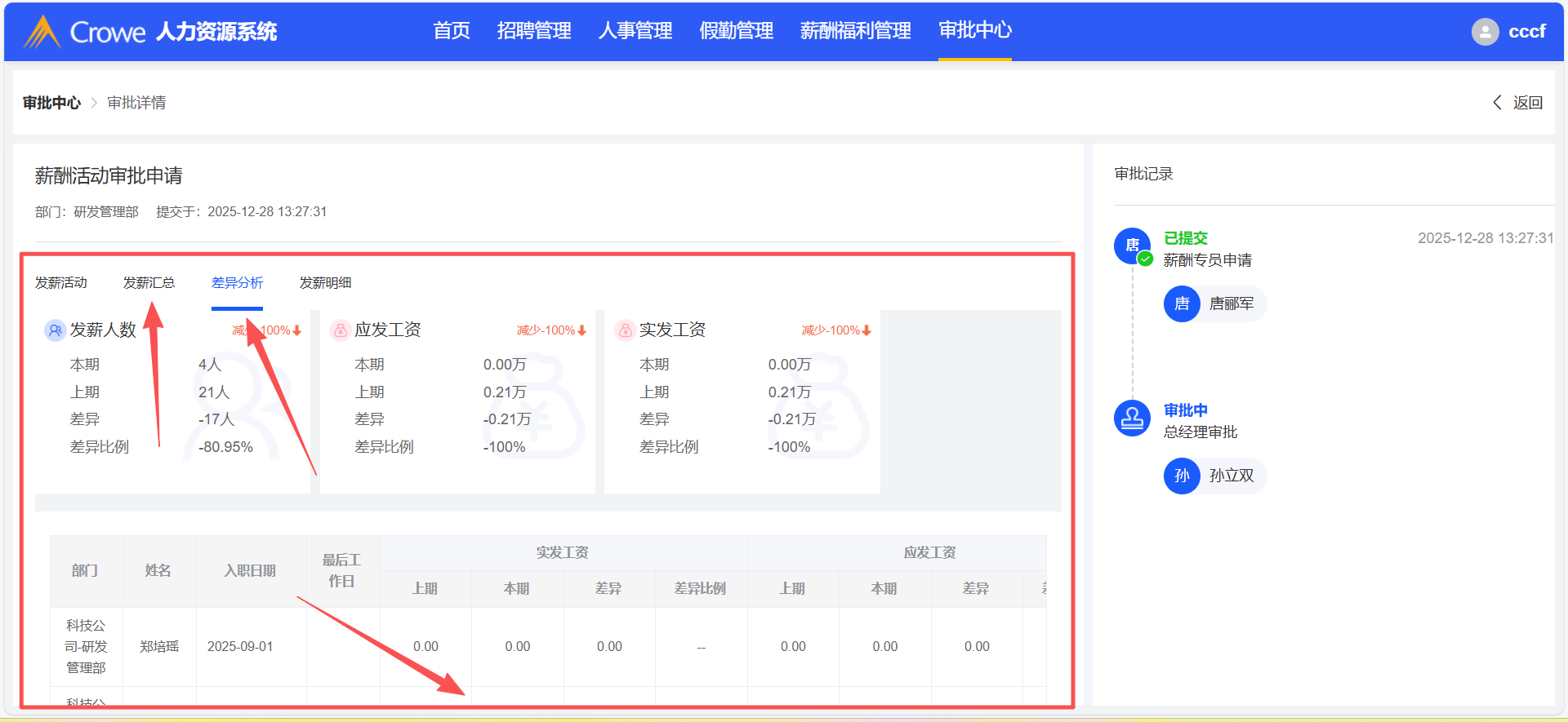 已关闭人力资源系统-审批中心,薪酬活动审批详情页,发薪汇总、差异分析tab页,加个上下滑动滚动条,因中间部分底部显示不全