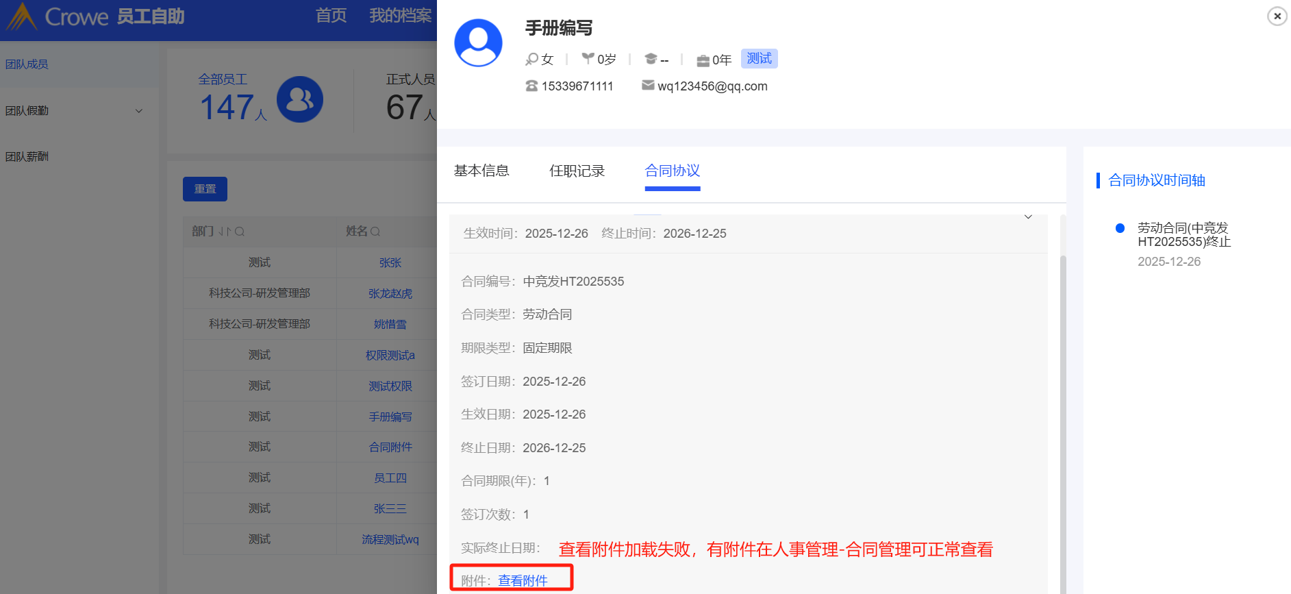 我的团队-团队成员:点击姓名,合同协议中的查看附件加载失败