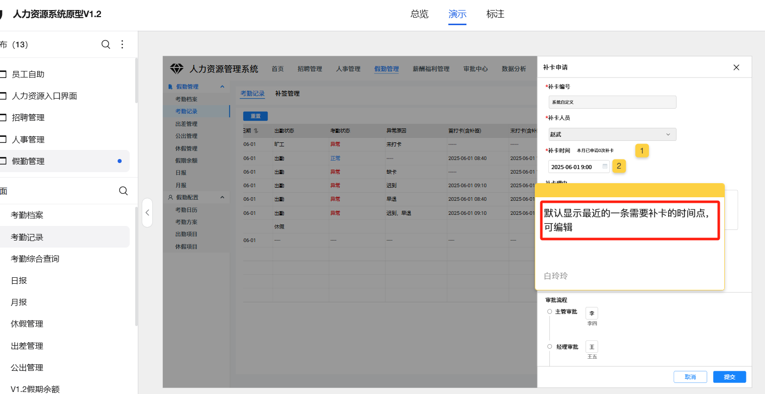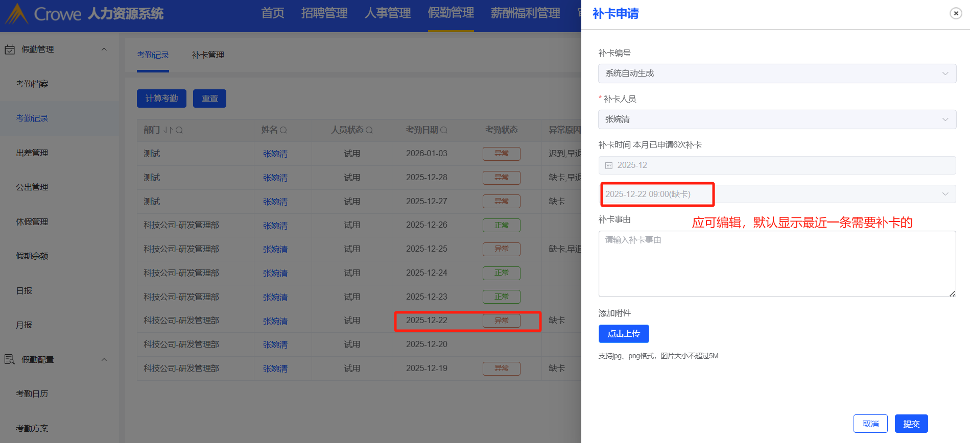 假勤管理-考勤记录-补卡:列表操作中点击补卡,补卡时间点应可编辑,默认显示最近的一条需要补卡的时间点