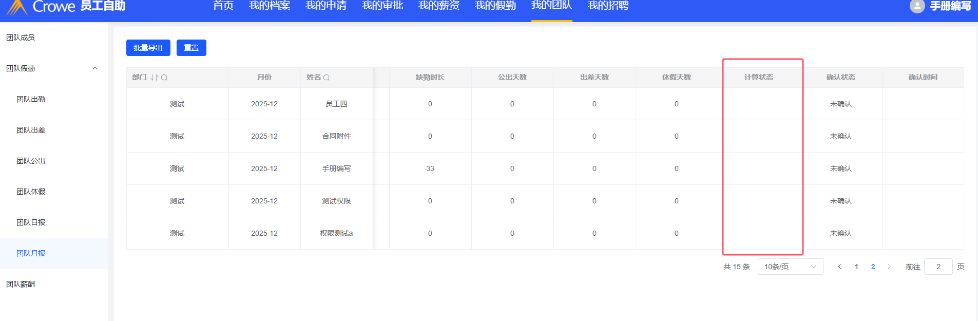 员工自助-我的团队-团队月报:原型中无计算状态一列