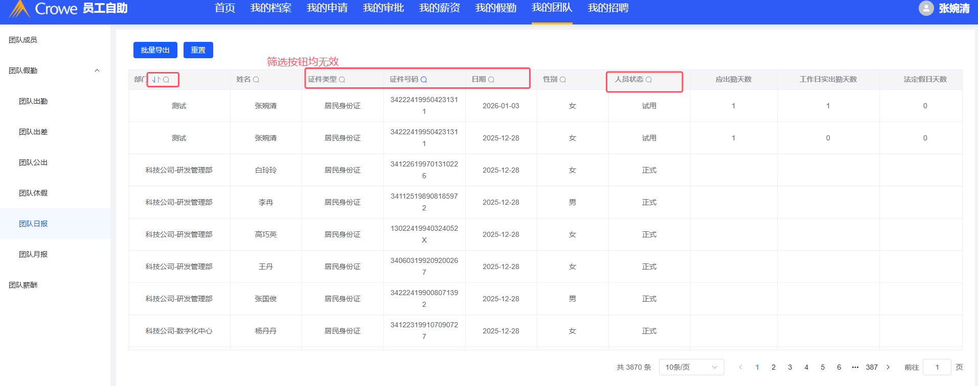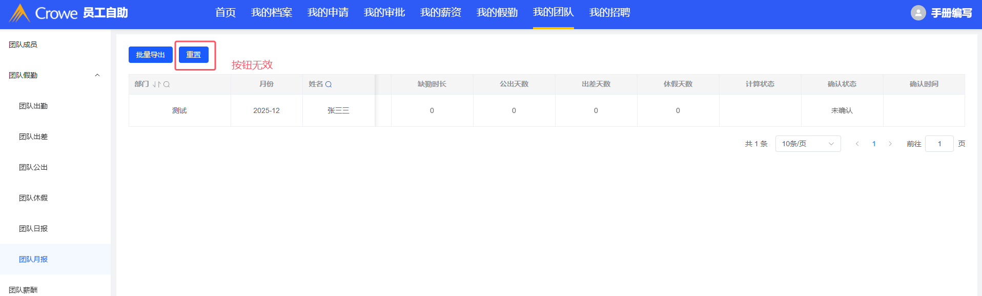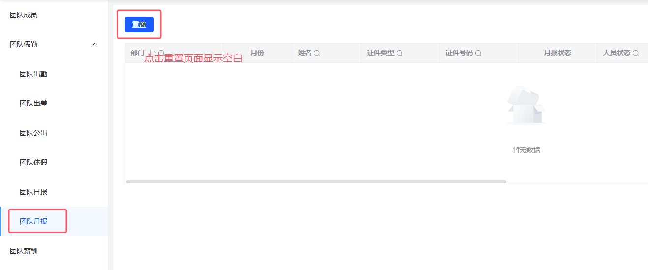 已关闭员工自助-我的团队-团队月报:重置按钮无效,部门、证件类型等筛选条件均无效