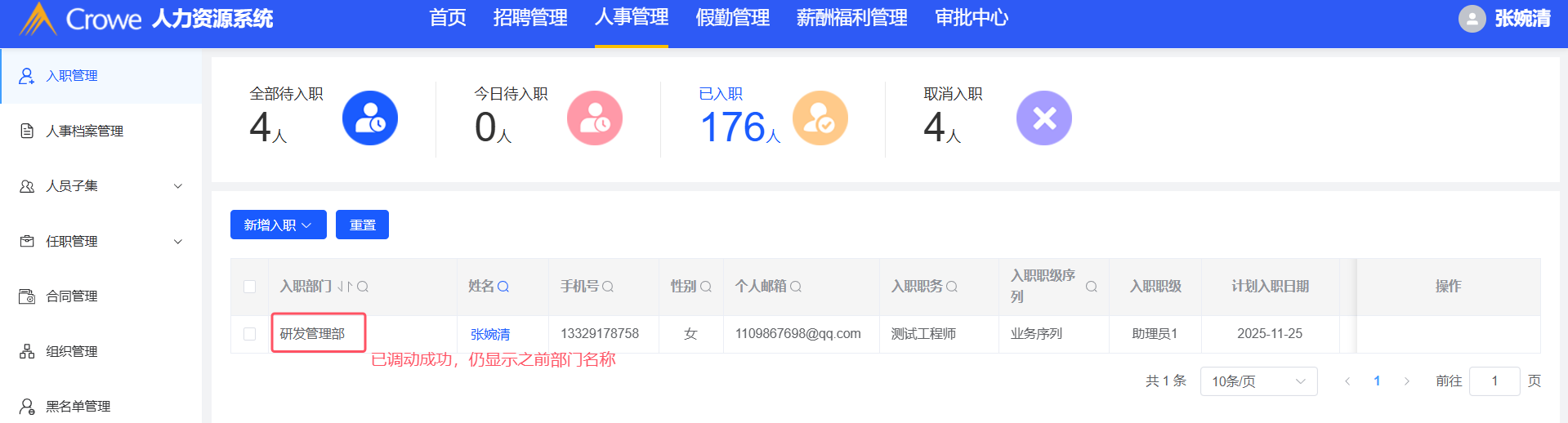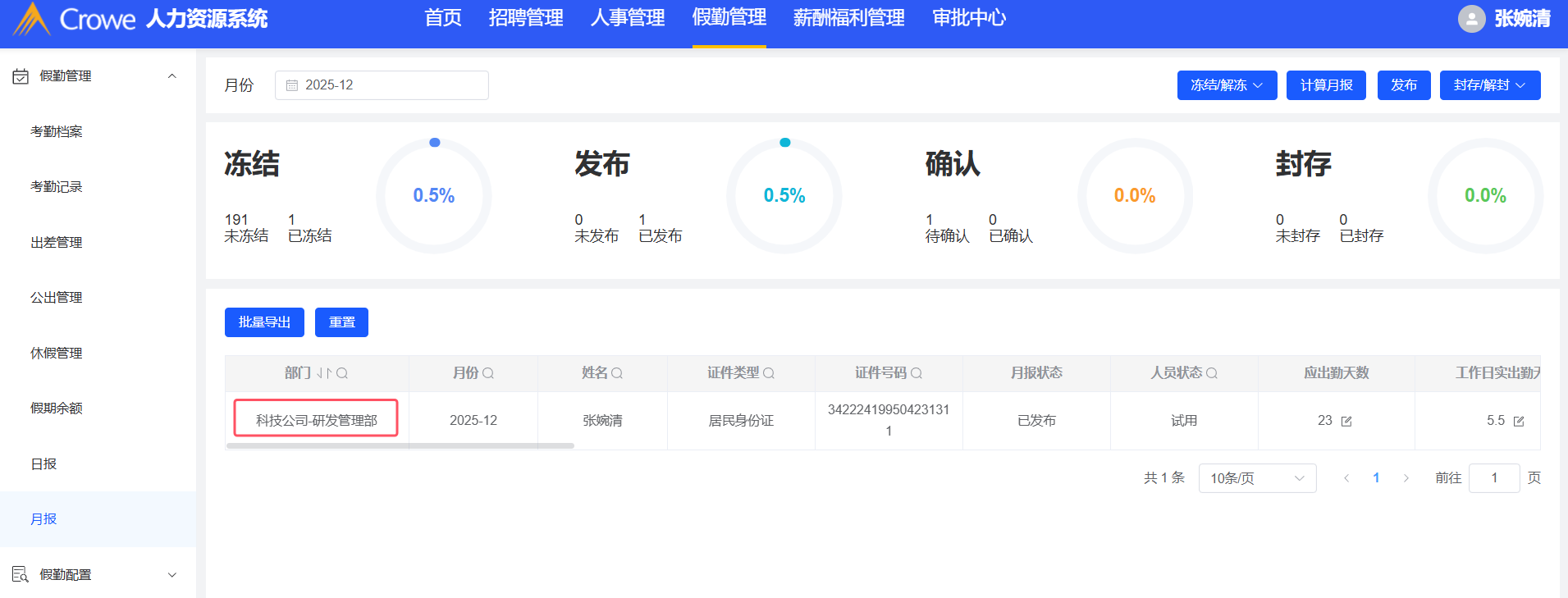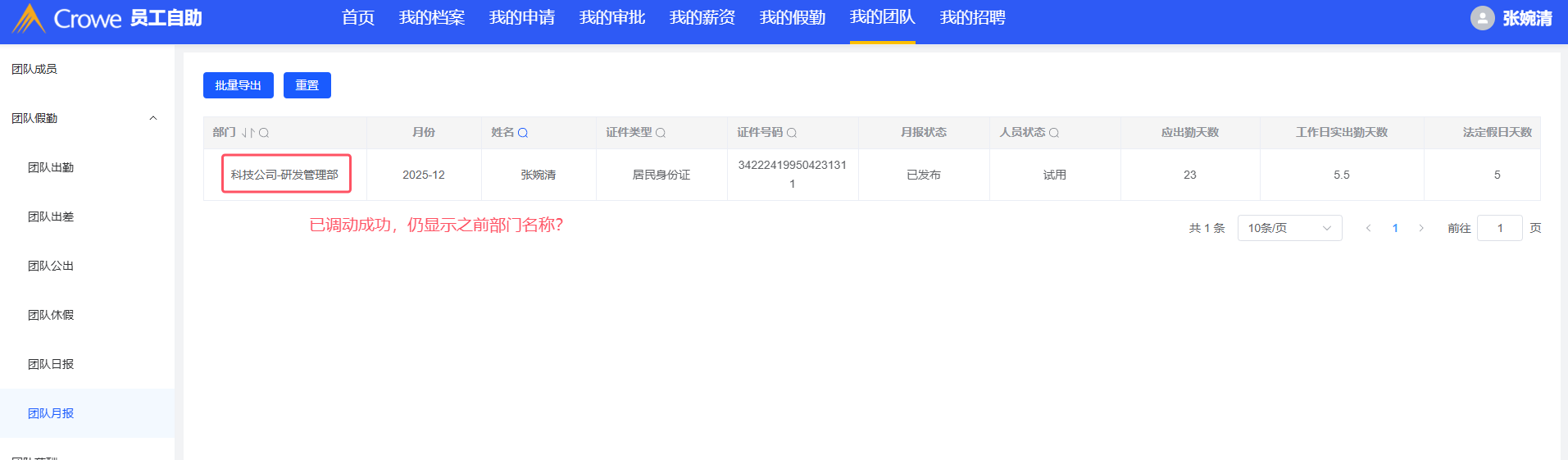 已关闭员工自助-我的团队-团队月报:人员部门已调动,仍显示之前的部门