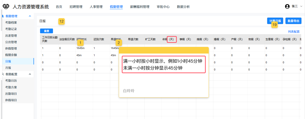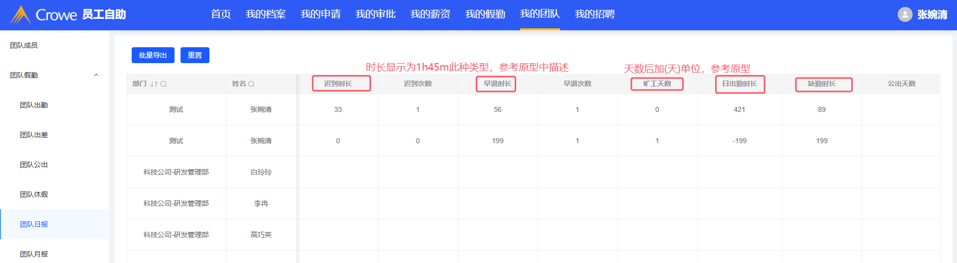 员工自助-我的团队-团队日报/月报:时长的显示及假勤字段后的单位添加