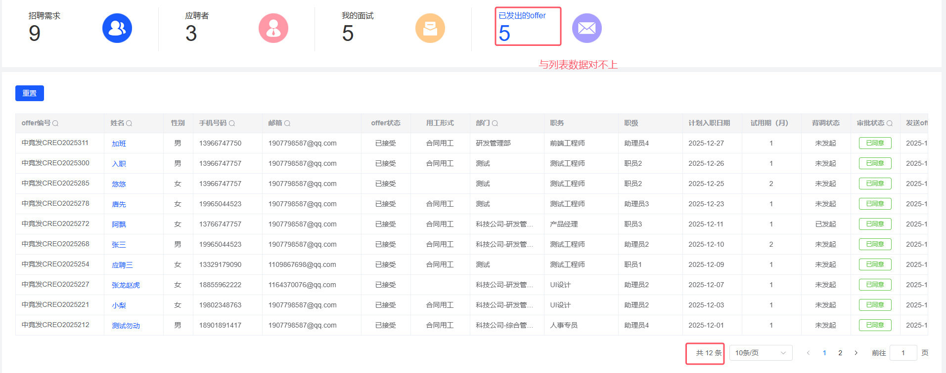 员工自助-我的招聘:已发出的offer总数显示与列表中数据不符