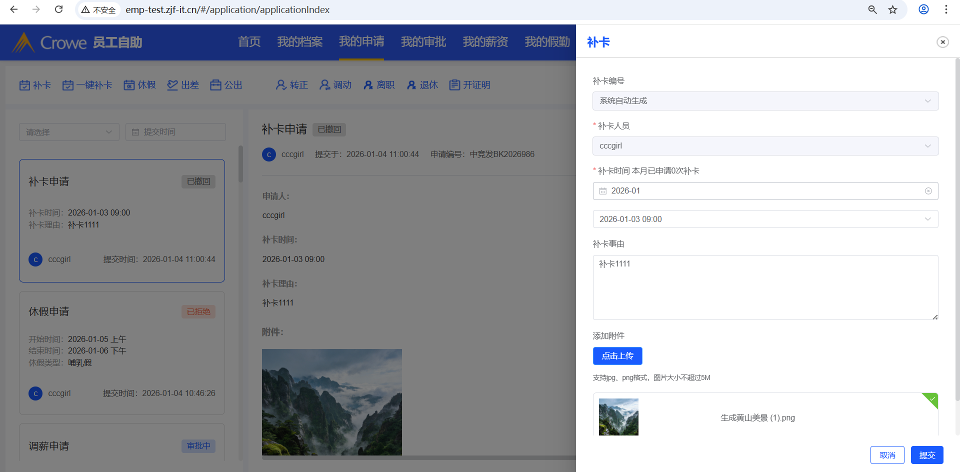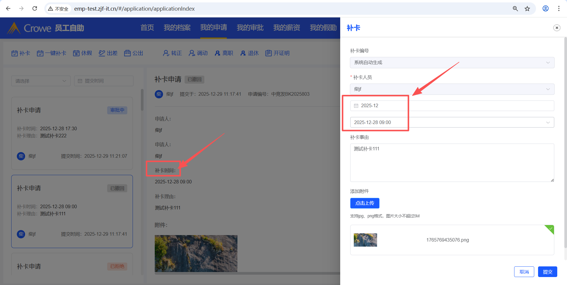 员工自助-我的申请-补卡申请,补卡撤销后,点击编辑,补卡抽屉未显示补卡时间字段