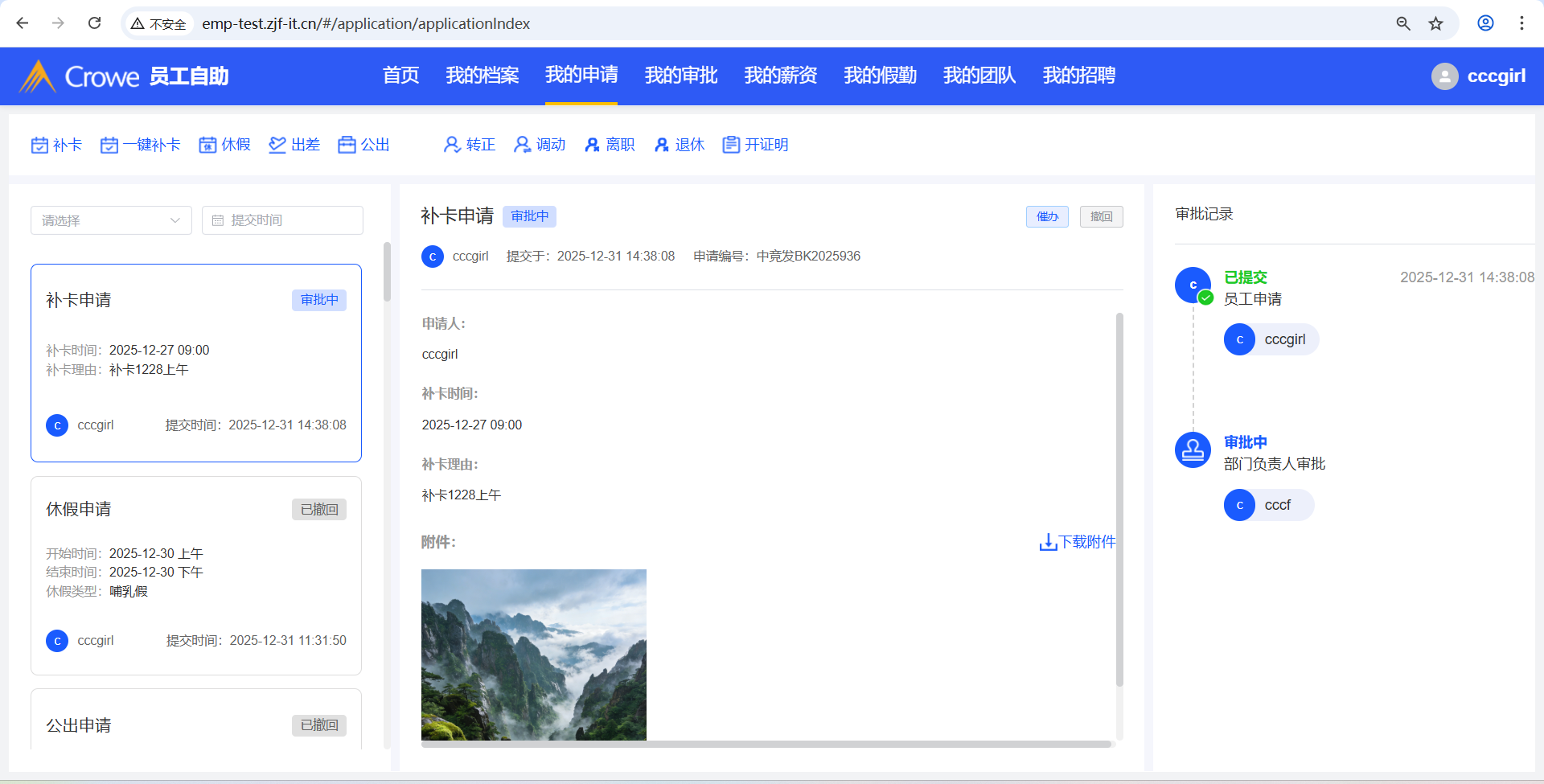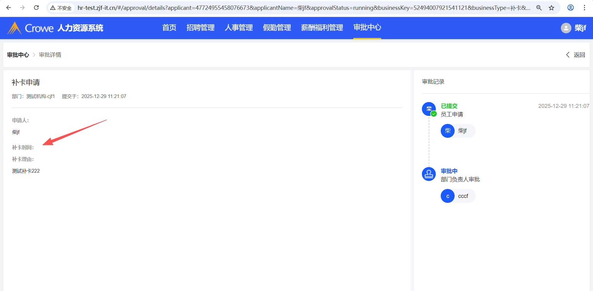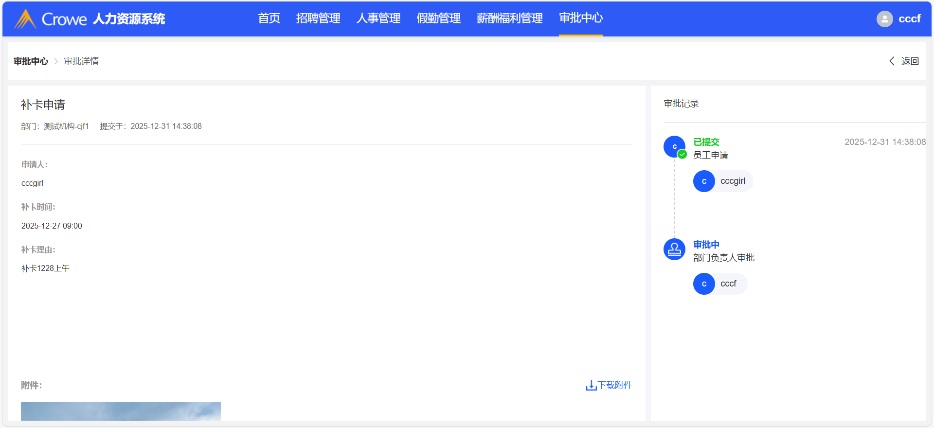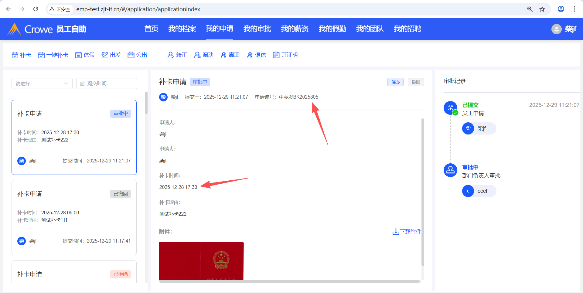 员工自助-我的申请,补卡申请后,在人力资源系统-审批中心的详情页,1、未显示补卡时间 2、未显示附件