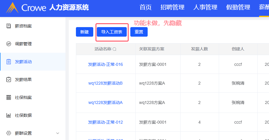 薪酬福利管理-发薪活动:导入工资表功能未做,按钮隐藏