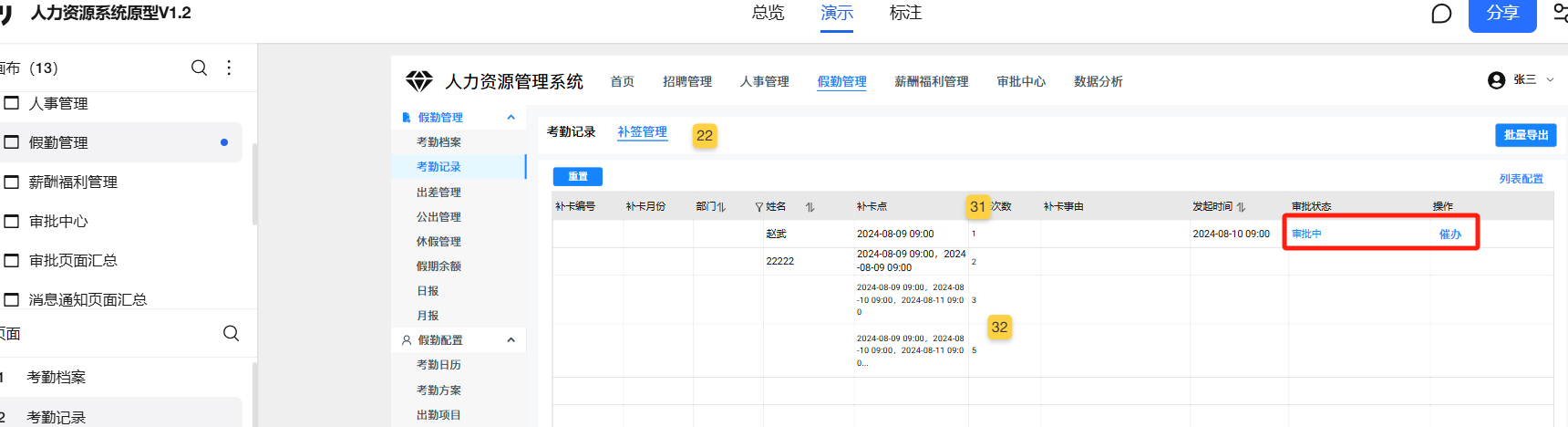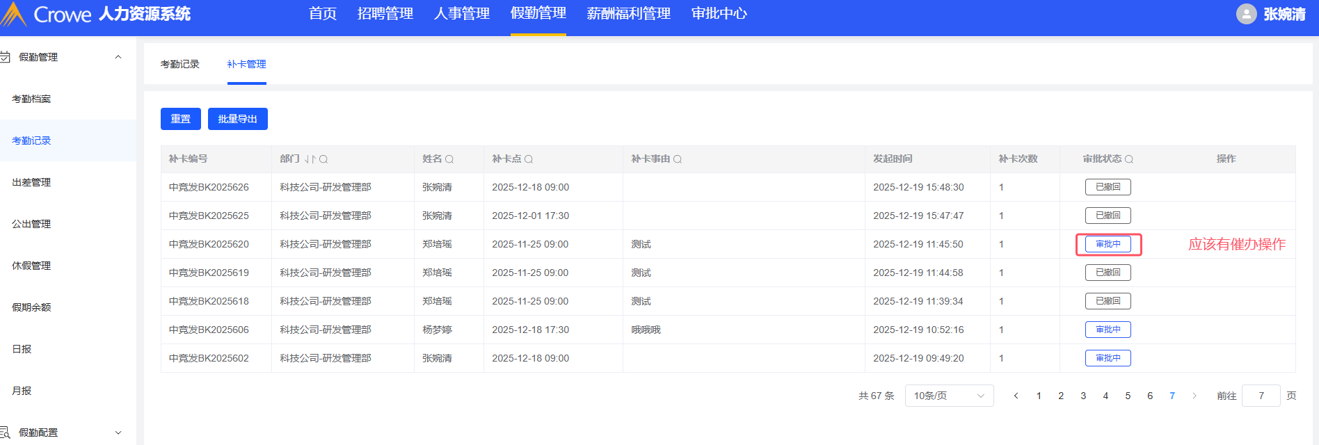 假勤管理-考勤记录-补卡管理:审批中状态的操作列中少了催办操作