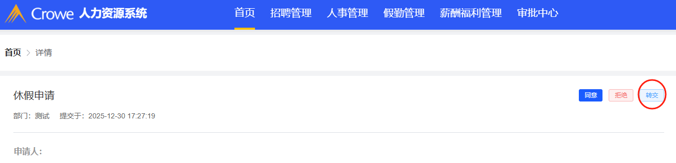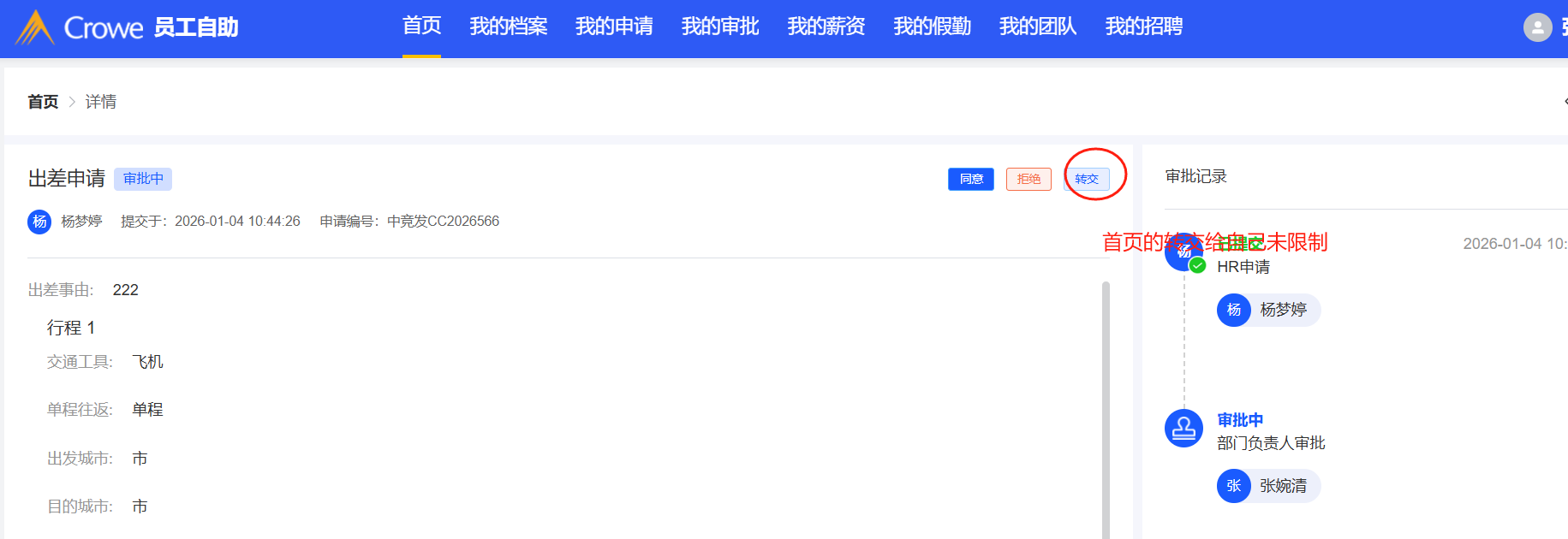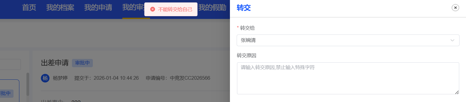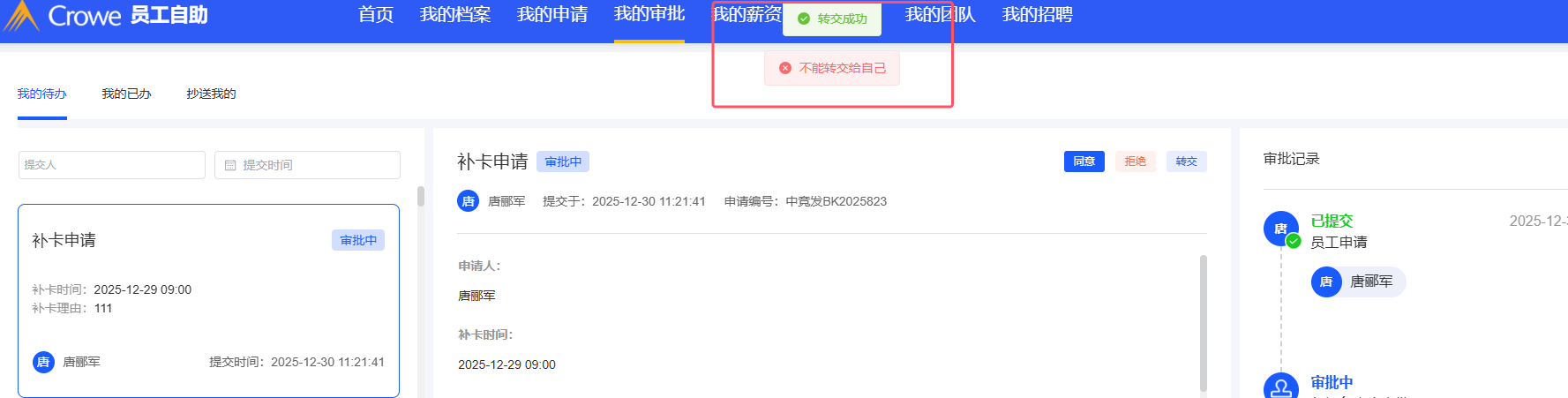 员工申请-我的审批:转交不能转交给本人,给出了两个提示,实际是转交成功了