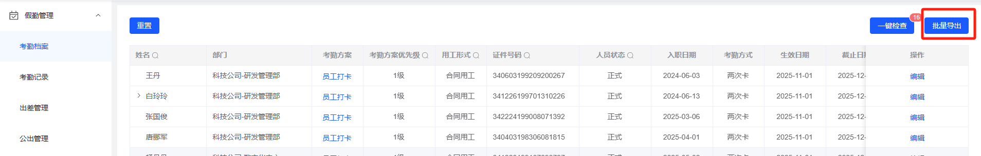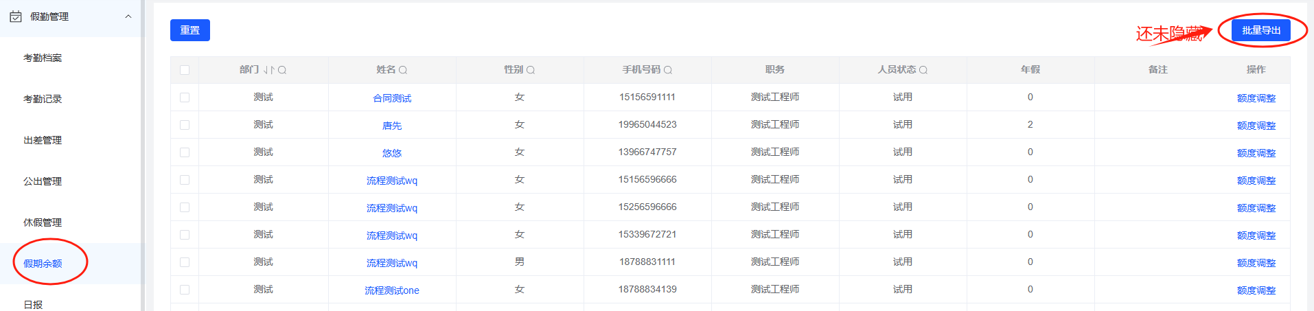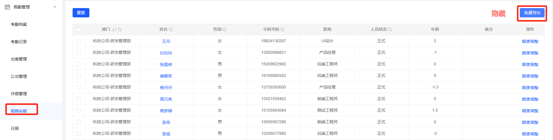 假勤管理:考勤档案、假期余额的批量导出按钮隐藏