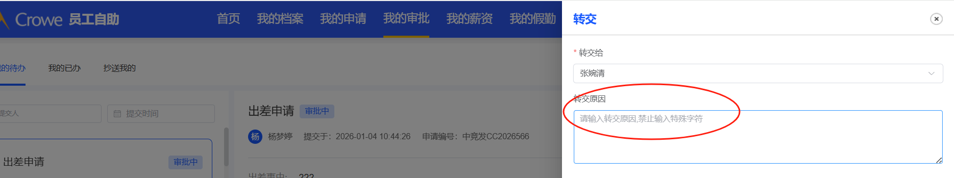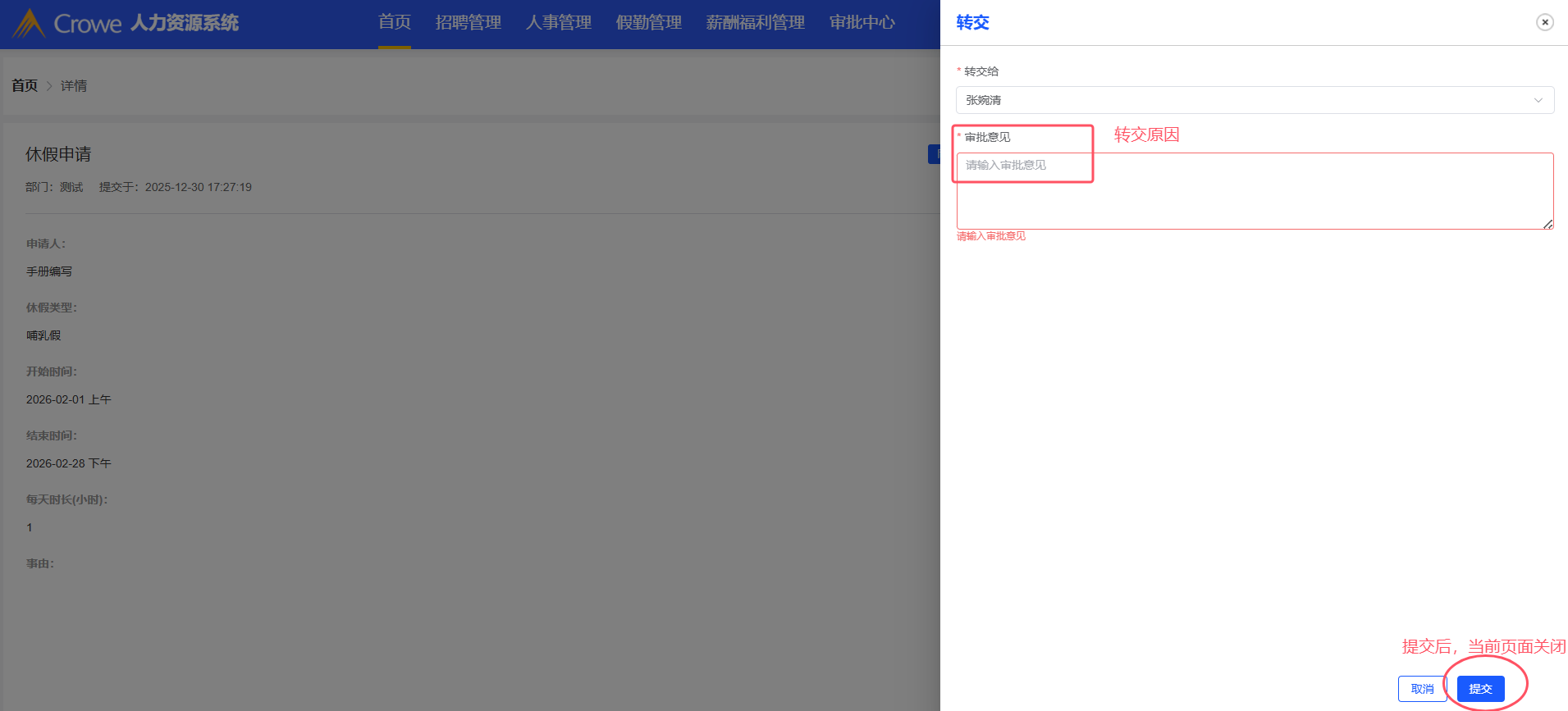 已关闭人力资源系统-首页:转交中显示的应为转交原因,点击提交按钮页面应关闭