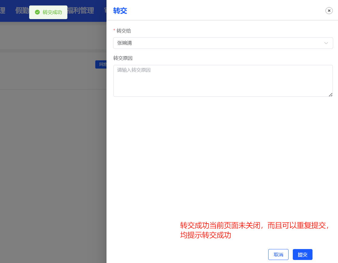 点击提交按钮转交页面未关闭,可以重复提交均提示成功,且转交给自己未做限制