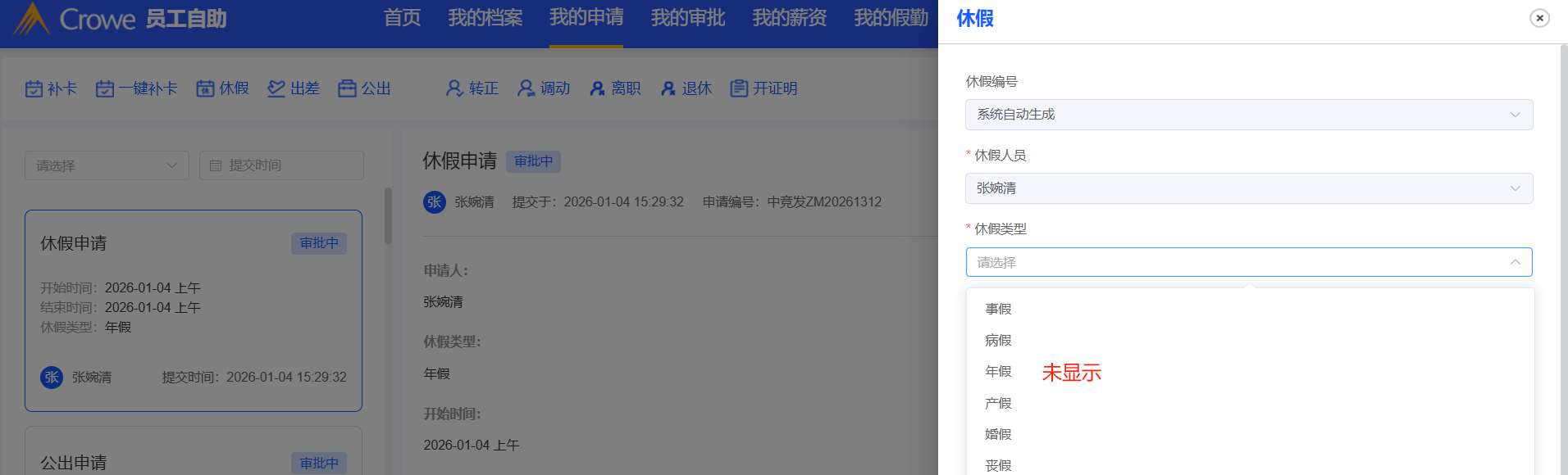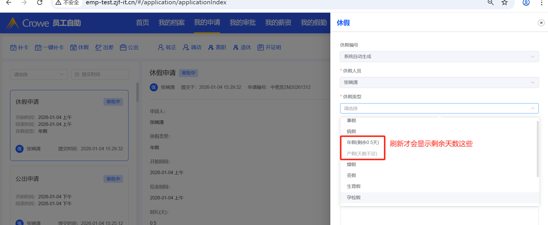 员工自助-我的申请:假期剩余天数的显示,刷新后才会显示