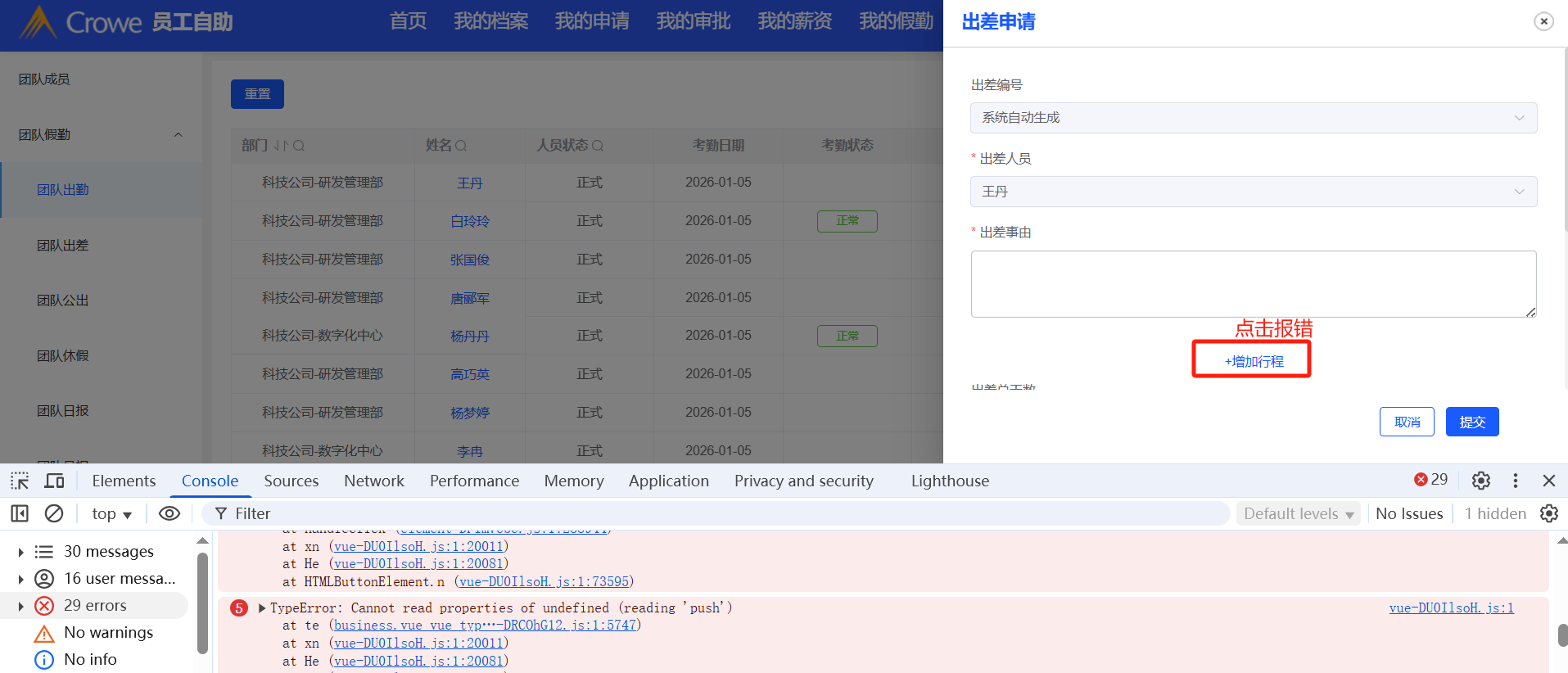 员工自助-团队假勤-团队出勤-出差:出差申请中“增加行程”报错