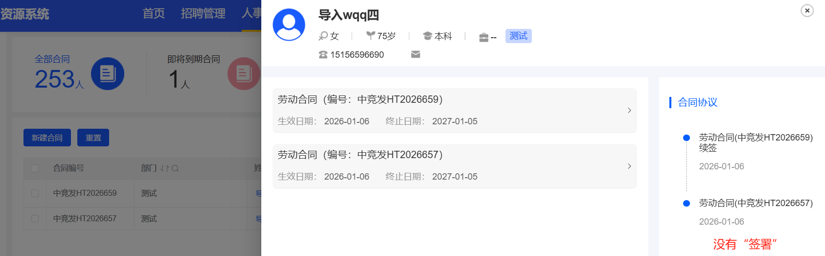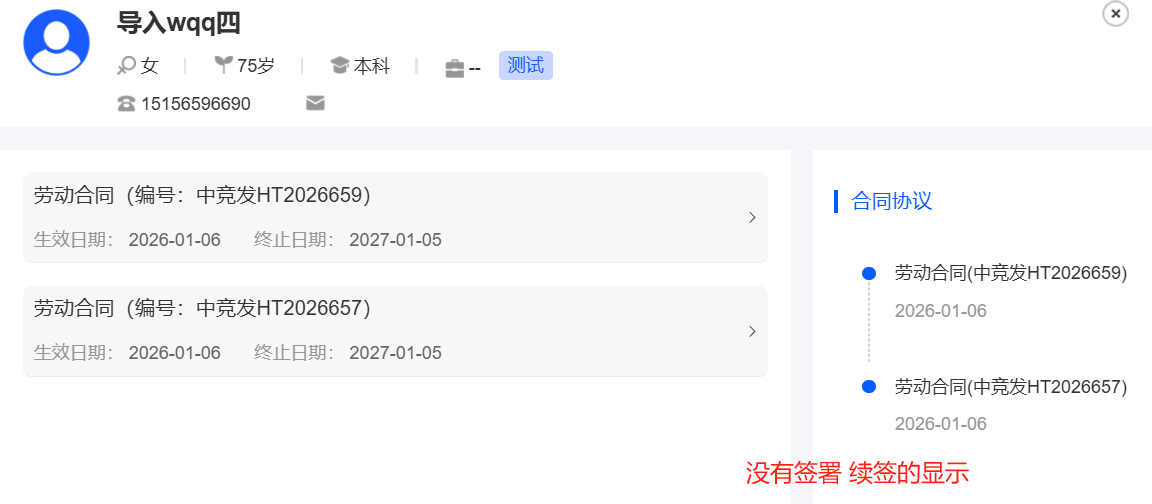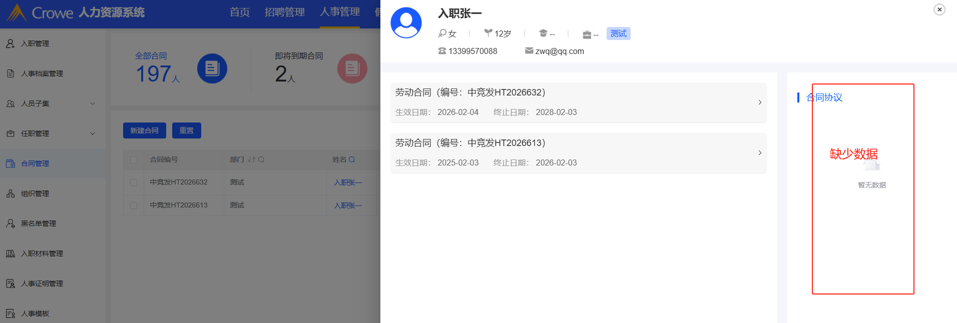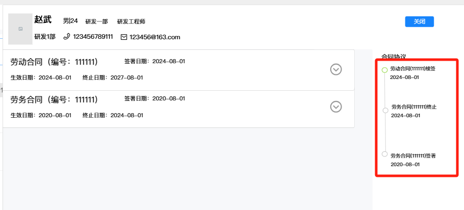 已关闭人事管理-合同管理:点击姓名查看合同详情,右侧缺少合同的时间轴显示