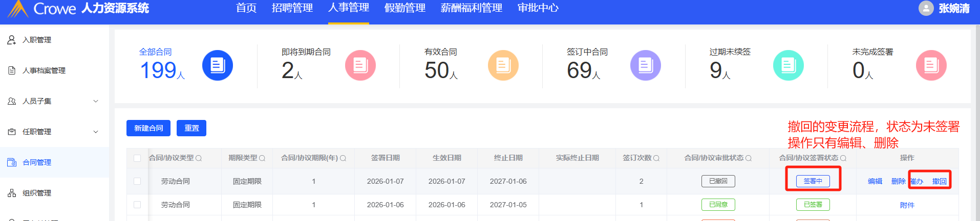 人事管理-合同管理:已撤回的合同,合同/协议审批状态为未签署,操作列没有催办和撤回