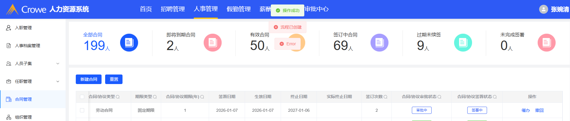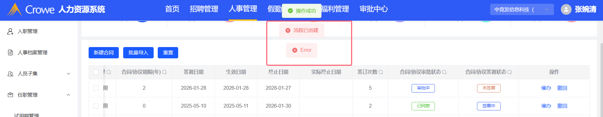 已关闭人事管理-合同管理:撤回的合同点击编辑再发起报错,列表显示为审批中,但实际未发起流程