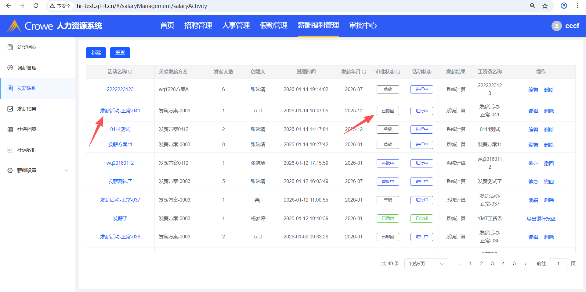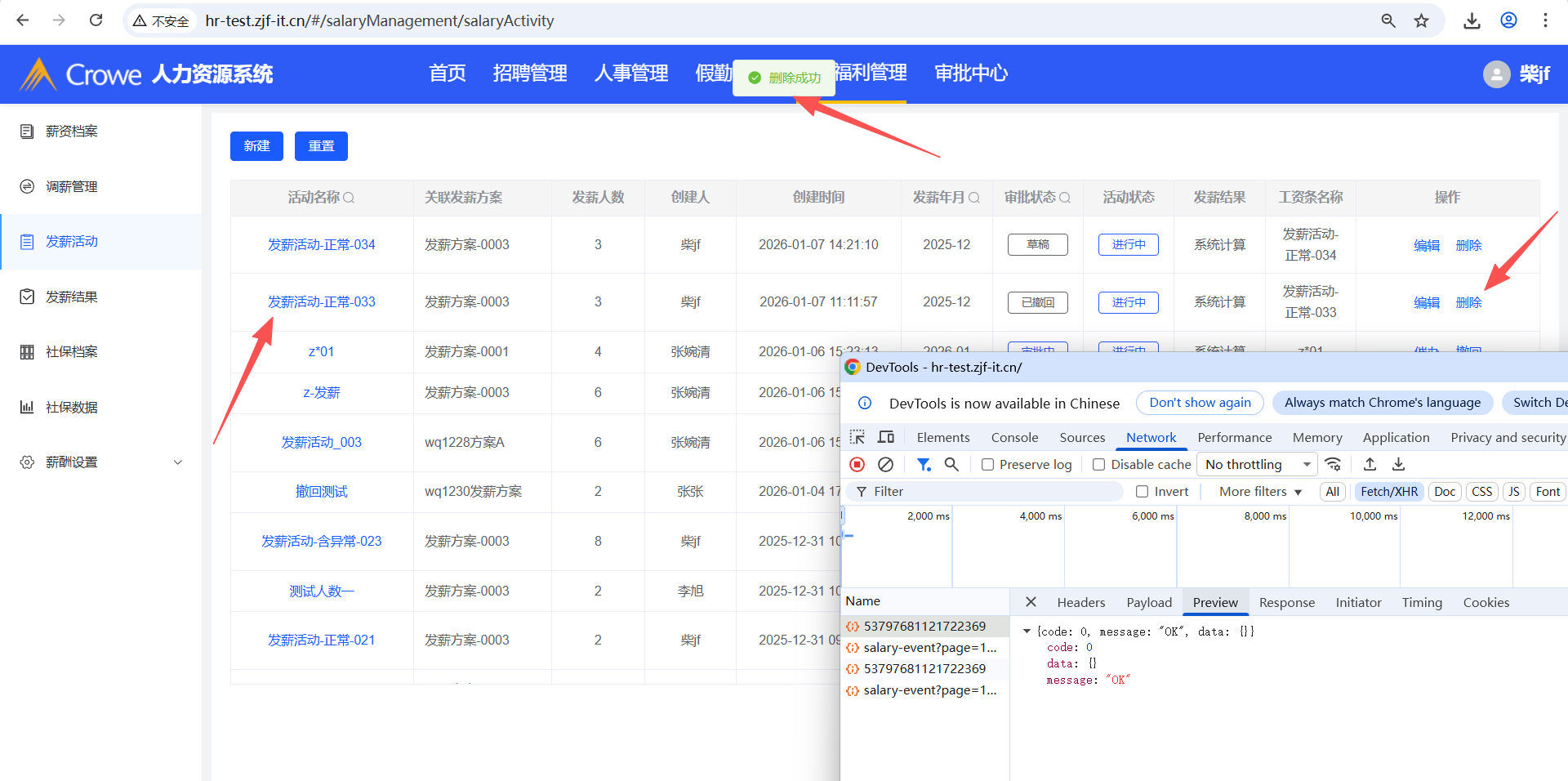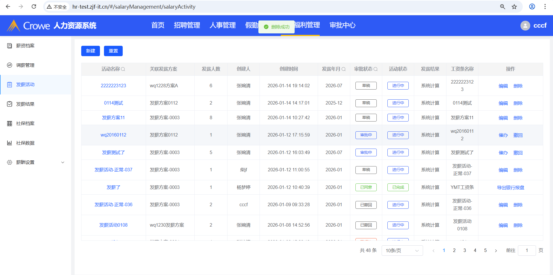 已关闭人力资源系统-薪酬福利管理-发薪活动,删除已撤回的发薪活动,显示删除成功,数据仍在页面上