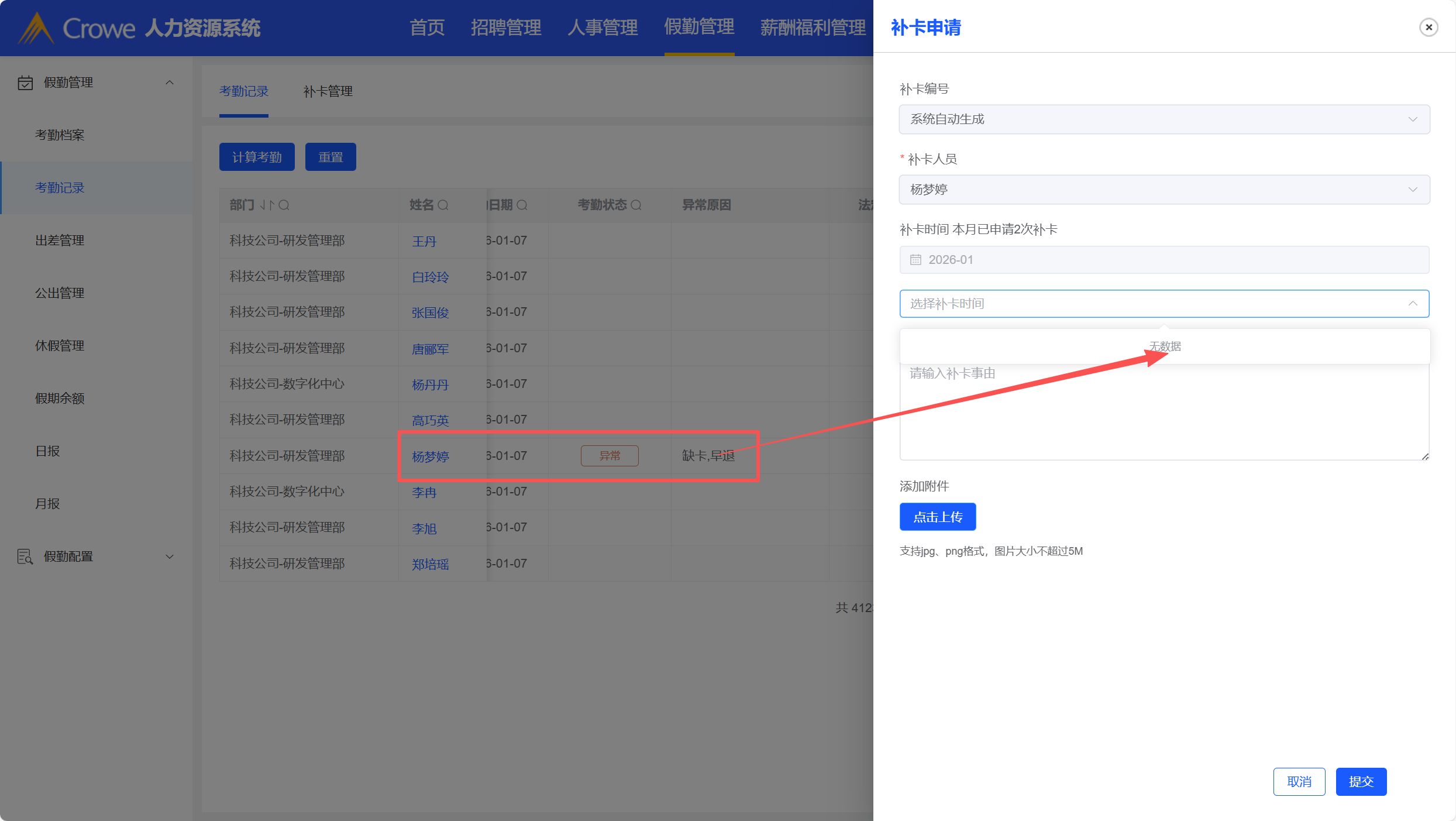 人力资源系统考勤记录里的补卡功能只获取该记录员工指定日期的缺卡数据,日期是今天的没有结束,不能获取到异常打卡数据