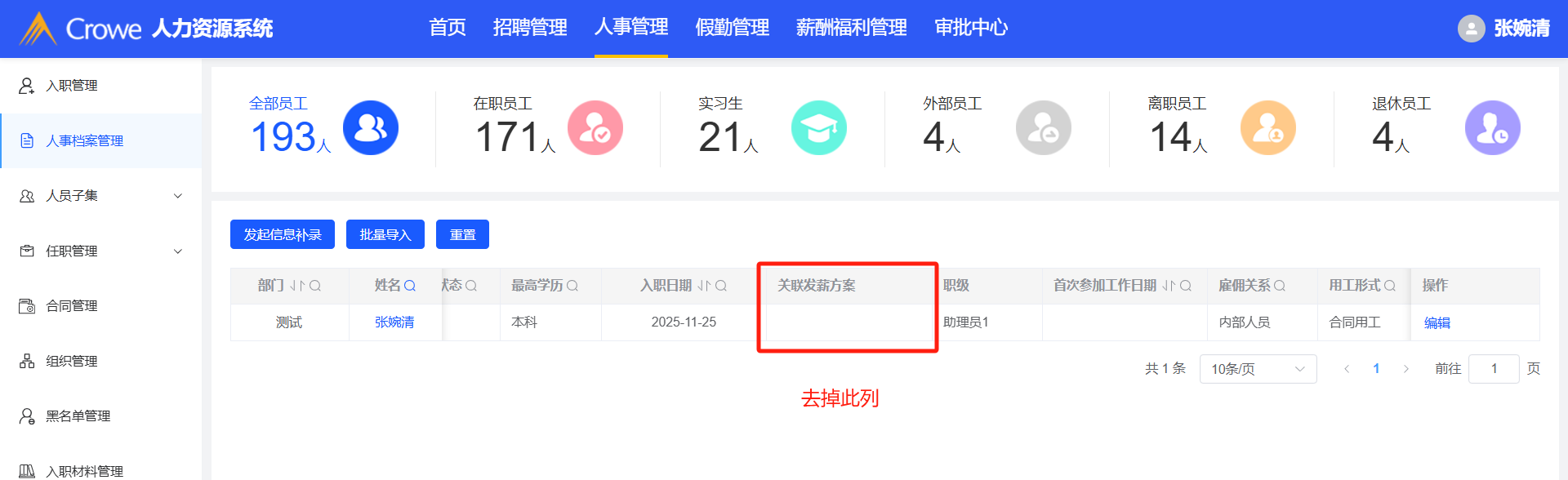 人事管理-人事档案管理:去掉关联发薪方案列
