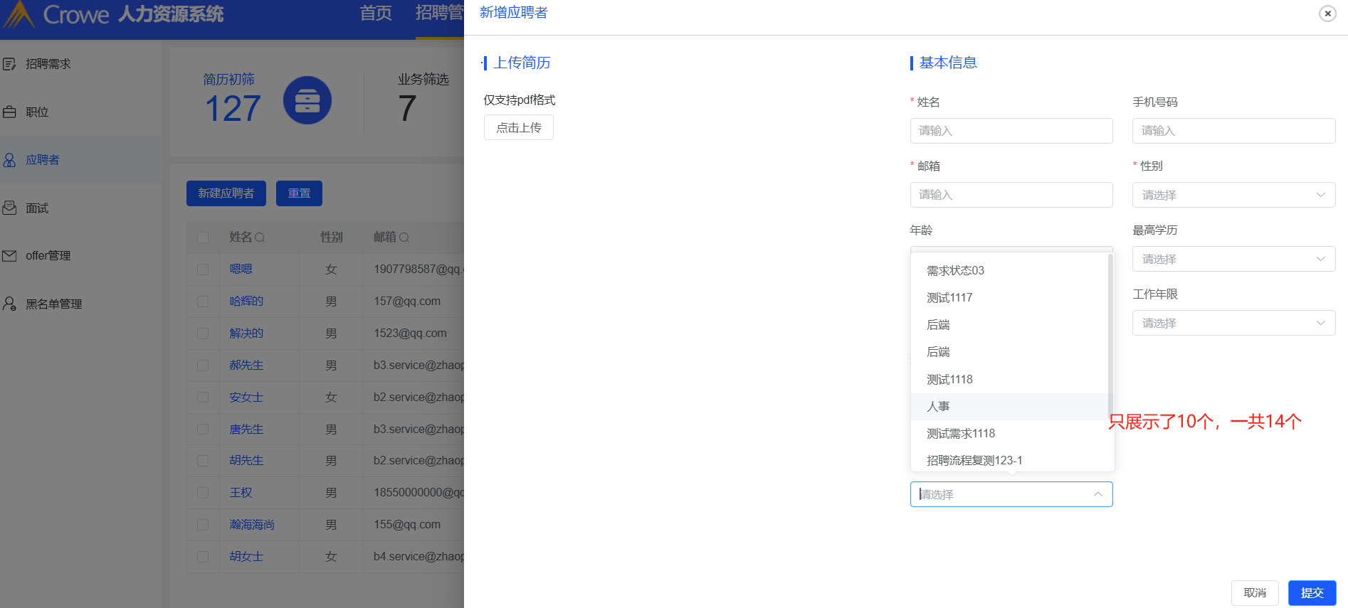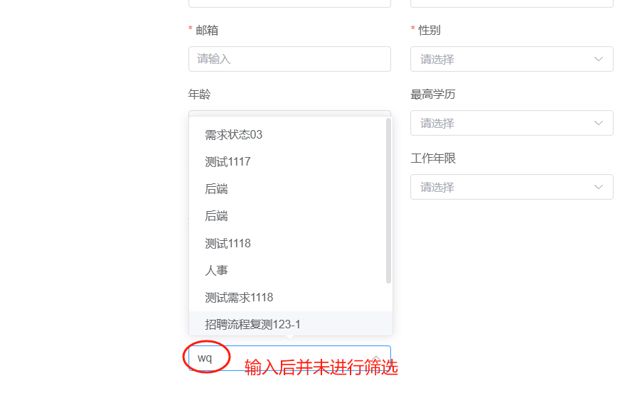 招聘管理-应聘者:新建应聘者关联需求时,需求缺少;需求选择框中可以输入数据,但输入数据后并未进行模糊搜索