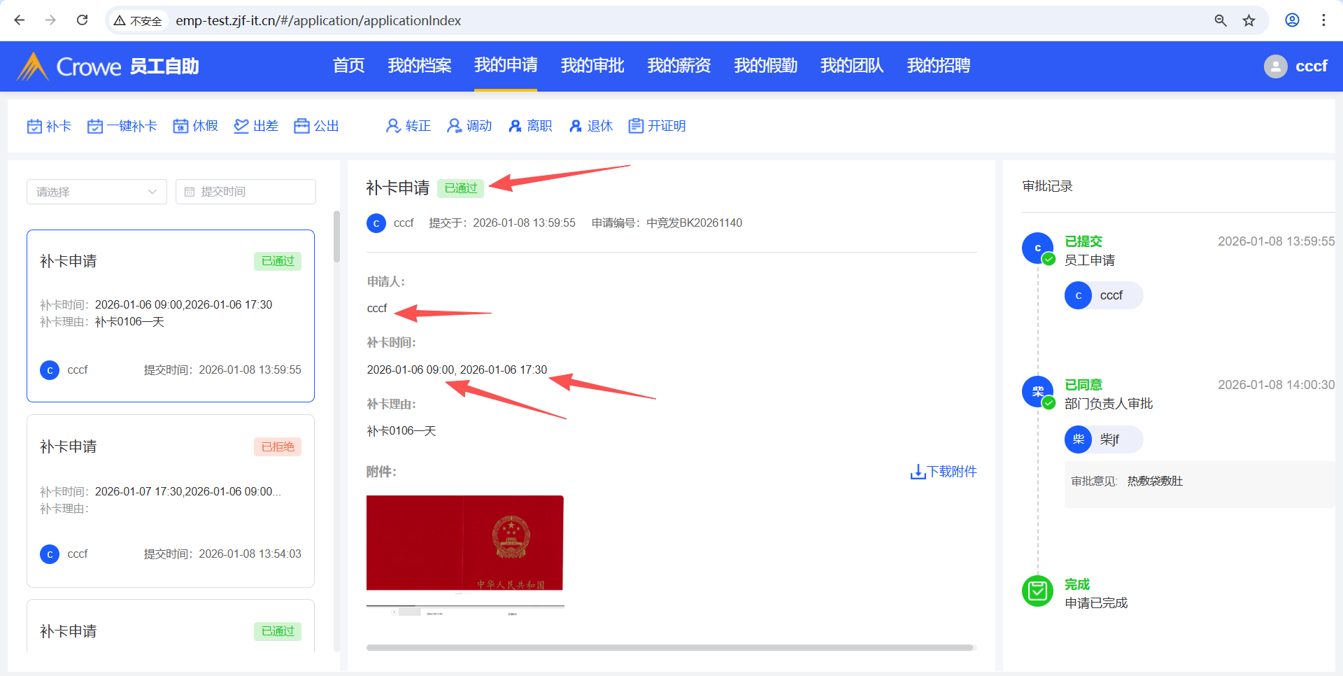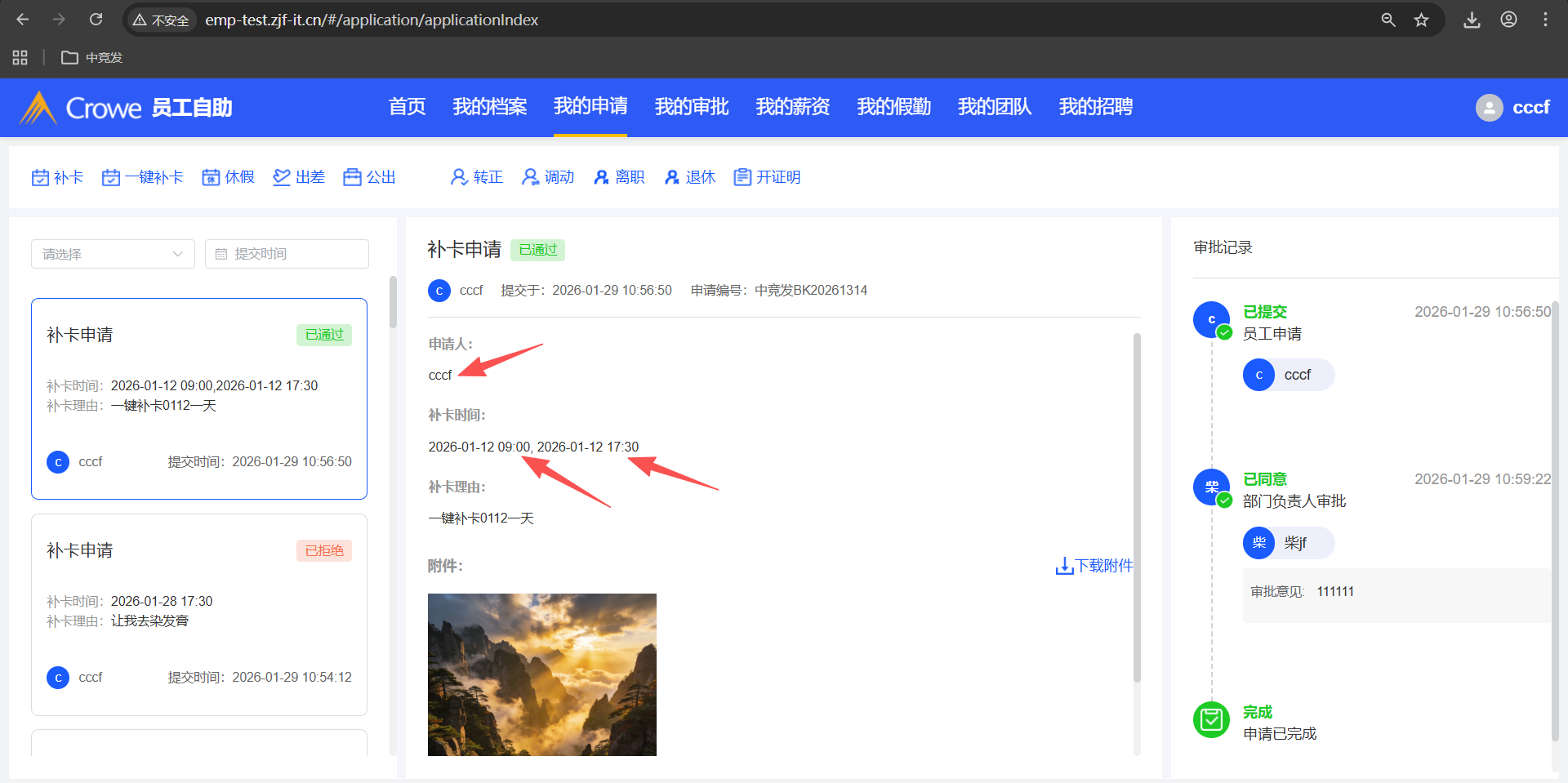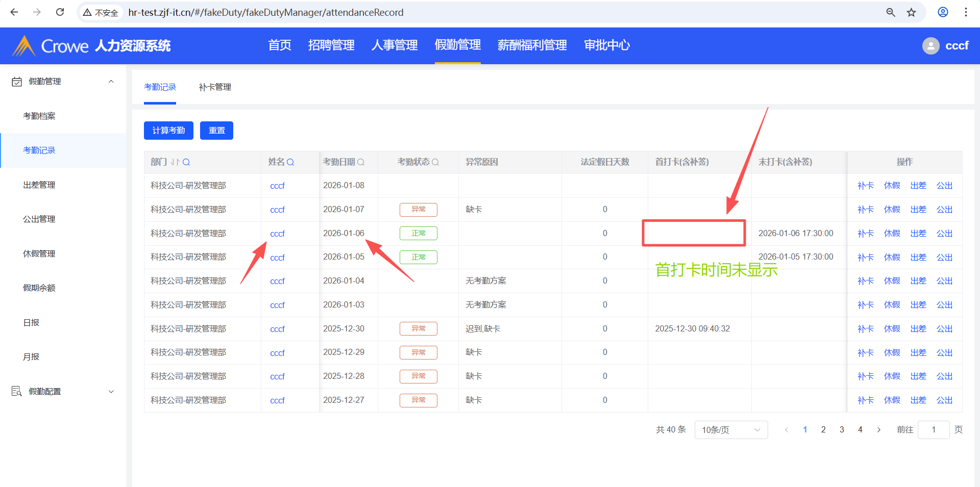 我的申请-补卡一天申请通过后,在人力资源系统-假勤管理-考勤记录,列表首打卡(含补签)未显示时间,但末打卡(含补签)显示时间了