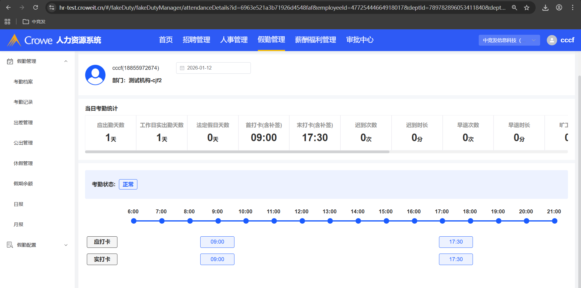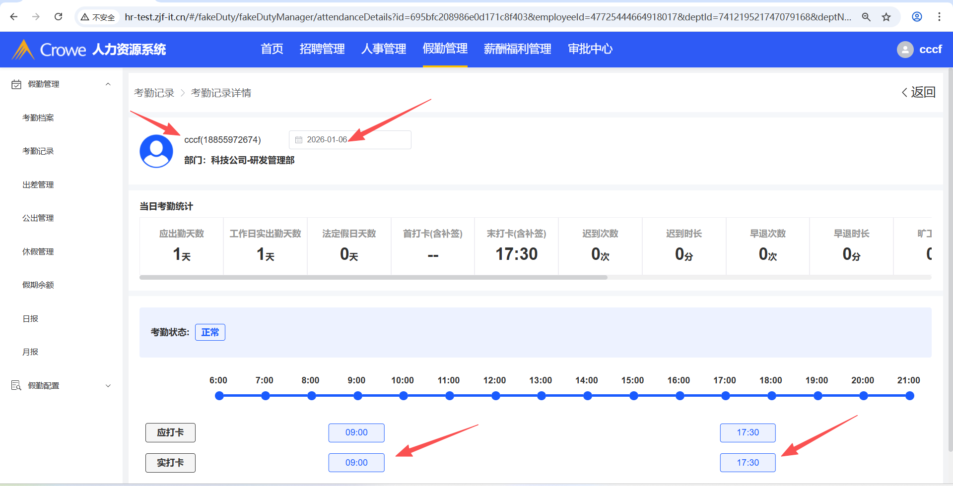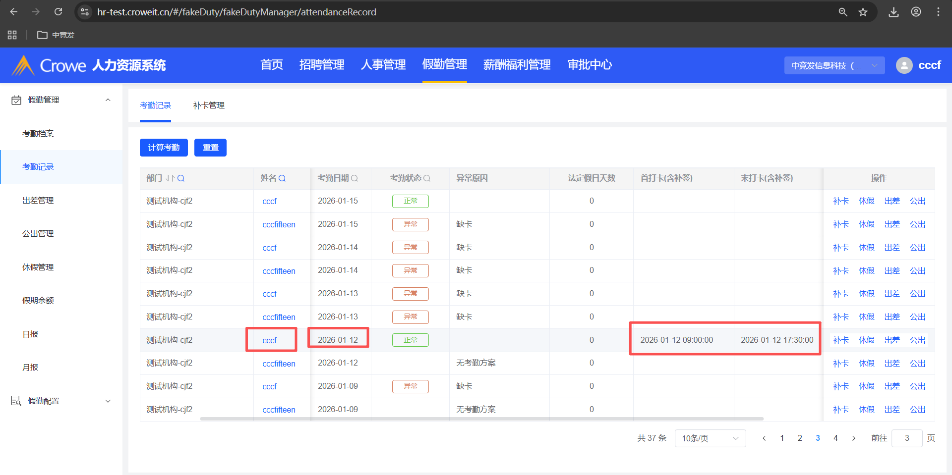 我的申请-补卡一天申请通过后,在人力资源系统-假勤管理-考勤记录,列表首打卡(含补签)未显示时间,但末打卡(含补签)显示时间了