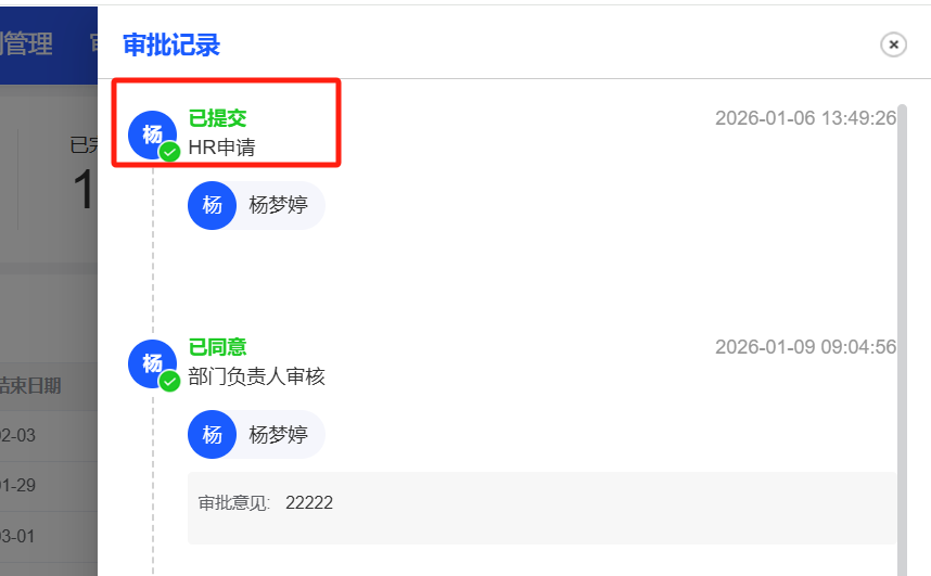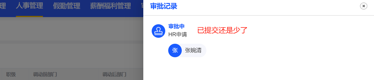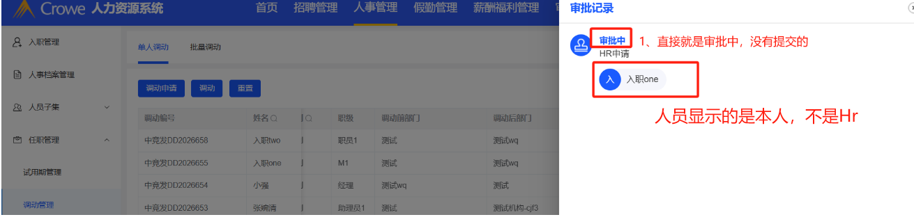 已关闭人事管理-调动管理:HR发起的调动,流程到了员工本人的我的申请中,显示的HR名称是本人