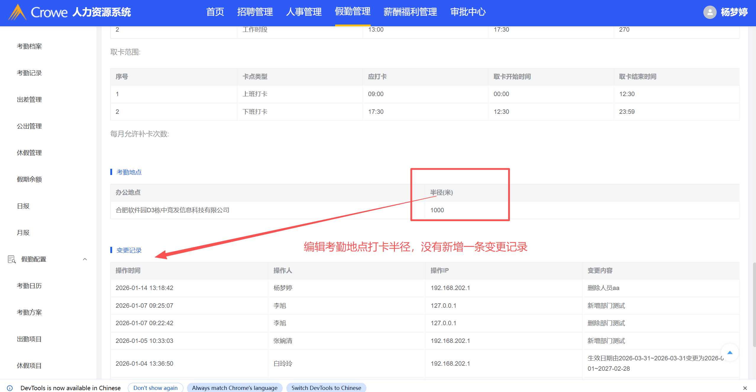 考勤方案-编辑考勤方案中的打卡半径,没有增加一条变更记录